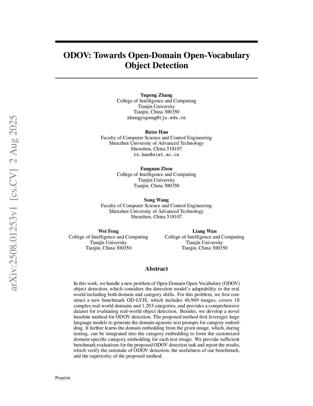 In this work, we handle a new problem of Open-Domain Open-Vocabulary (ODOV) object detection, which considers the detection model's adaptability to the real world including both domain and category shifts. For this problem, we first construct a new benchmark OD-LVIS, which includes 46,949 images, covers 18 complex real-world domains and 1,203 categories, and provides a comprehensive dataset for evaluating real-world object detection. Besides, we develop a novel baseline method for ODOVthis http URLproposed method first leverages large language models to generate the domain-agnostic text prompts for category embedding. It further learns the domain embedding from the given image, which, during testing, can be integrated into the category embedding to form the customized domain-specific category embedding for each test image. We provide sufficient benchmark evaluations for the proposed ODOV detection task and report the results, which verify the rationale of ODOV detection, the usefulness of our benchmark, and the superiority of the proposed method.