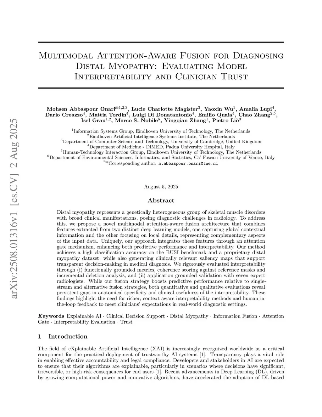 Distal myopathy represents a genetically heterogeneous group of skeletal muscle disorders with broad clinical manifestations, posing diagnostic challenges in radiology. To address this, we propose a novel multimodal attention-aware fusion architecture that combines features extracted from two distinct deep learning models, one capturing global contextual information and the other focusing on local details, representing complementary aspects of the input data. Uniquely, our approach integrates these features through an attention gate mechanism, enhancing both predictive performance and interpretability. Our method achieves a high classification accuracy on the BUSI benchmark and a proprietary distal myopathy dataset, while also generating clinically relevant saliency maps that support transparent decision-making in medical diagnosis. We rigorously evaluated interpretability through (1) functionally grounded metrics, coherence scoring against reference masks and incremental deletion analysis, and (2) application-grounded validation with seven expert radiologists. While our fusion strategy boosts predictive performance relative to single-stream and alternative fusion strategies, both quantitative and qualitative evaluations reveal persistent gaps in anatomical specificity and clinical usefulness of the interpretability. These findings highlight the need for richer, context-aware interpretability methods and human-in-the-loop feedback to meet clinicians' expectations in real-world diagnostic settings.