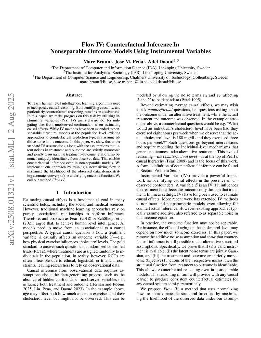 To reach human level intelligence, learning algorithms need to incorporate causal reasoning. But identifying causality, and particularly counterfactual reasoning, remains an elusive task. In this paper, we make progress on this task by utilizing instrumental variables (IVs). IVs are a classic tool for mitigating bias from unobserved confounders when estimating causal effects. While IV methods have been extended to non-separable structural models at the population level, existing approaches to counterfactual prediction typically assume additive noise in the outcome. In this paper, we show that under standard IV assumptions, along with the assumptions that latent noises in treatment and outcome are strictly monotonic and jointly Gaussian, the treatment-outcome relationship becomes uniquely identifiable from observed data. This enables counterfactual inference even in nonseparable models. We implement our approach by training a normalizing flow to maximize the likelihood of the observed data, demonstrating accurate recovery of the underlying outcome function. We call our method Flow IV.