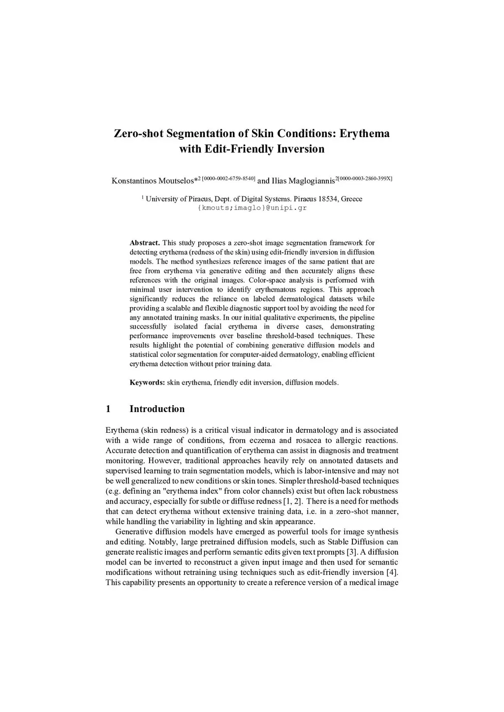 This study proposes a zero-shot image segmentation framework for detecting erythema (redness of the skin) using edit-friendly inversion in diffusion models. The method synthesizes reference images of the same patient that are free from erythema via generative editing and then accurately aligns these references with the original images. Color-space analysis is performed with minimal user intervention to identify erythematous regions. This approach significantly reduces the reliance on labeled dermatological datasets while providing a scalable and flexible diagnostic support tool by avoiding the need for any annotated training masks. In our initial qualitative experiments, the pipeline successfully isolated facial erythema in diverse cases, demonstrating performance improvements over baseline threshold-based techniques. These results highlight the potential of combining generative diffusion models and statistical color segmentation for computer-aided dermatology, enabling efficient erythema detection without prior training data.