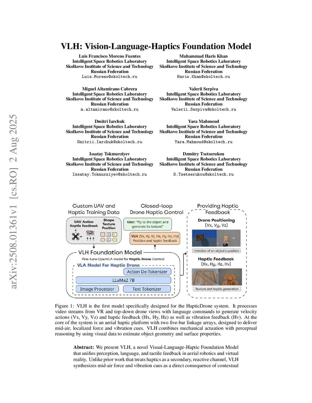 We present VLH, a novel Visual-Language-Haptic Foundation Model that unifies perception, language, and tactile feedback in aerial robotics and virtual reality. Unlike prior work that treats haptics as a secondary, reactive channel, VLH synthesizes mid-air force and vibration cues as a direct consequence of contextual visual understanding and natural language commands. Our platform comprises an 8-inch quadcopter equipped with dual inverse five-bar linkage arrays for localized haptic actuation, an egocentric VR camera, and an exocentric top-down view. Visual inputs and language instructions are processed by a fine-tuned OpenVLA backbone - adapted via LoRA on a bespoke dataset of 450 multimodal scenarios - to output a 7-dimensional action vector (Vx, Vy, Vz, Hx, Hy, Hz, Hv). INT8 quantization and a high-performance server ensure real-time operation at 4-5 Hz. In human-robot interaction experiments (90 flights), VLH achieved a 56.7% success rate for target acquisition (mean reach time 21.3 s, pose error 0.24 m) and 100% accuracy in texture discrimination. Generalization tests yielded 70.0% (visual), 54.4% (motion), 40.0% (physical), and 35.0% (semantic) performance on novel tasks. These results demonstrate VLH's ability to co-evolve haptic feedback with perceptual reasoning and intent, advancing expressive, immersive human-robot interactions.