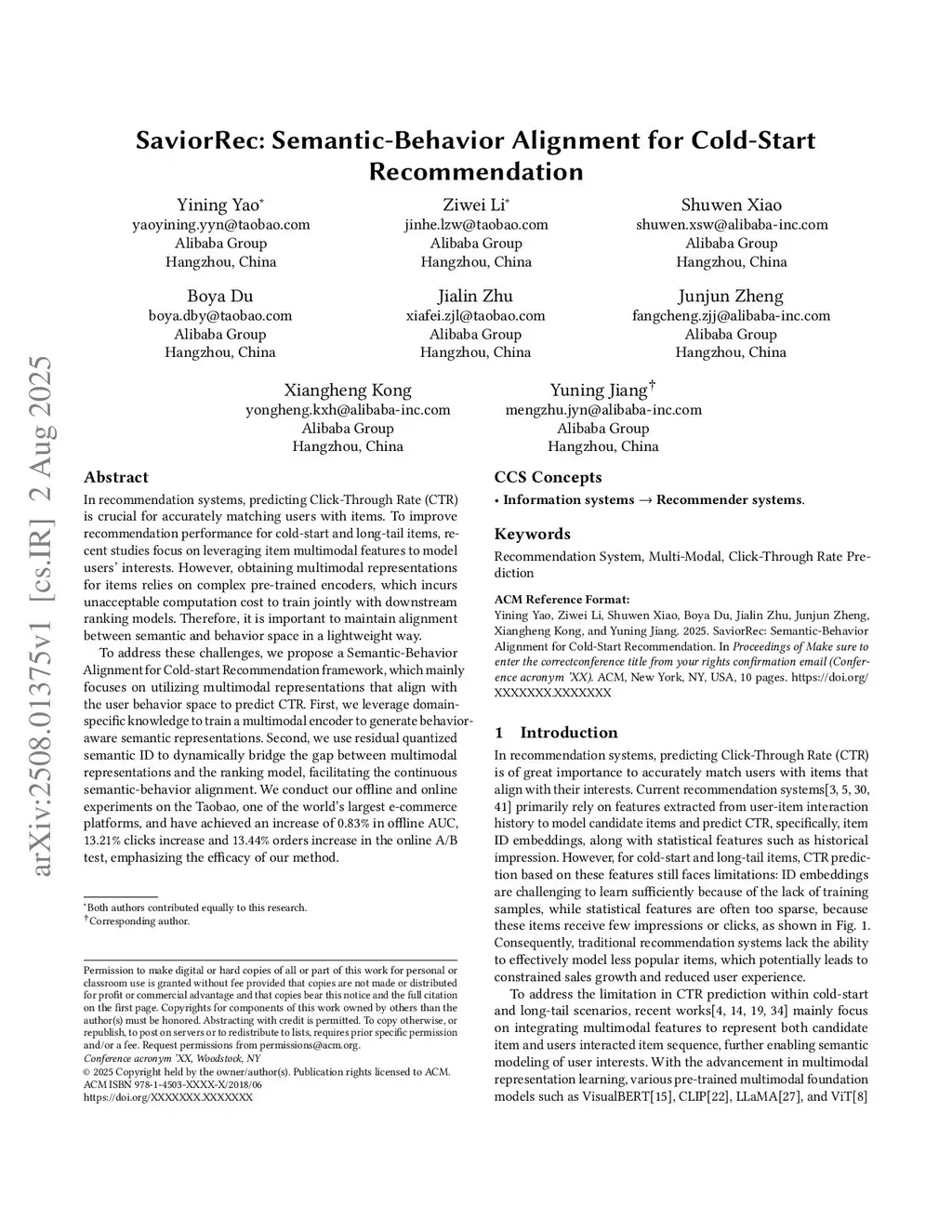 In recommendation systems, predicting Click-Through Rate (CTR) is crucial for accurately matching users with items. To improve recommendation performance for cold-start and long-tail items, recent studies focus on leveraging item multimodal features to model users' interests. However, obtaining multimodal representations for items relies on complex pre-trained encoders, which incurs unacceptable computation cost to train jointly with downstream ranking models. Therefore, it is important to maintain alignment between semantic and behavior space in a lightweight way.To address these challenges, we propose a Semantic-Behavior Alignment for Cold-start Recommendation framework, which mainly focuses on utilizing multimodal representations that align with the user behavior space to predict CTR. First, we leverage domain-specific knowledge to train a multimodal encoder to generate behavior-aware semantic representations. Second, we use residual quantized semantic ID to dynamically bridge the gap between multimodal representations and the ranking model, facilitating the continuous semantic-behavior alignment. We conduct our offline and online experiments on the Taobao, one of the world's largest e-commerce platforms, and have achieved an increase of 0.83% in offline AUC, 13.21% clicks increase and 13.44% orders increase in the online A/B test, emphasizing the efficacy of our method.