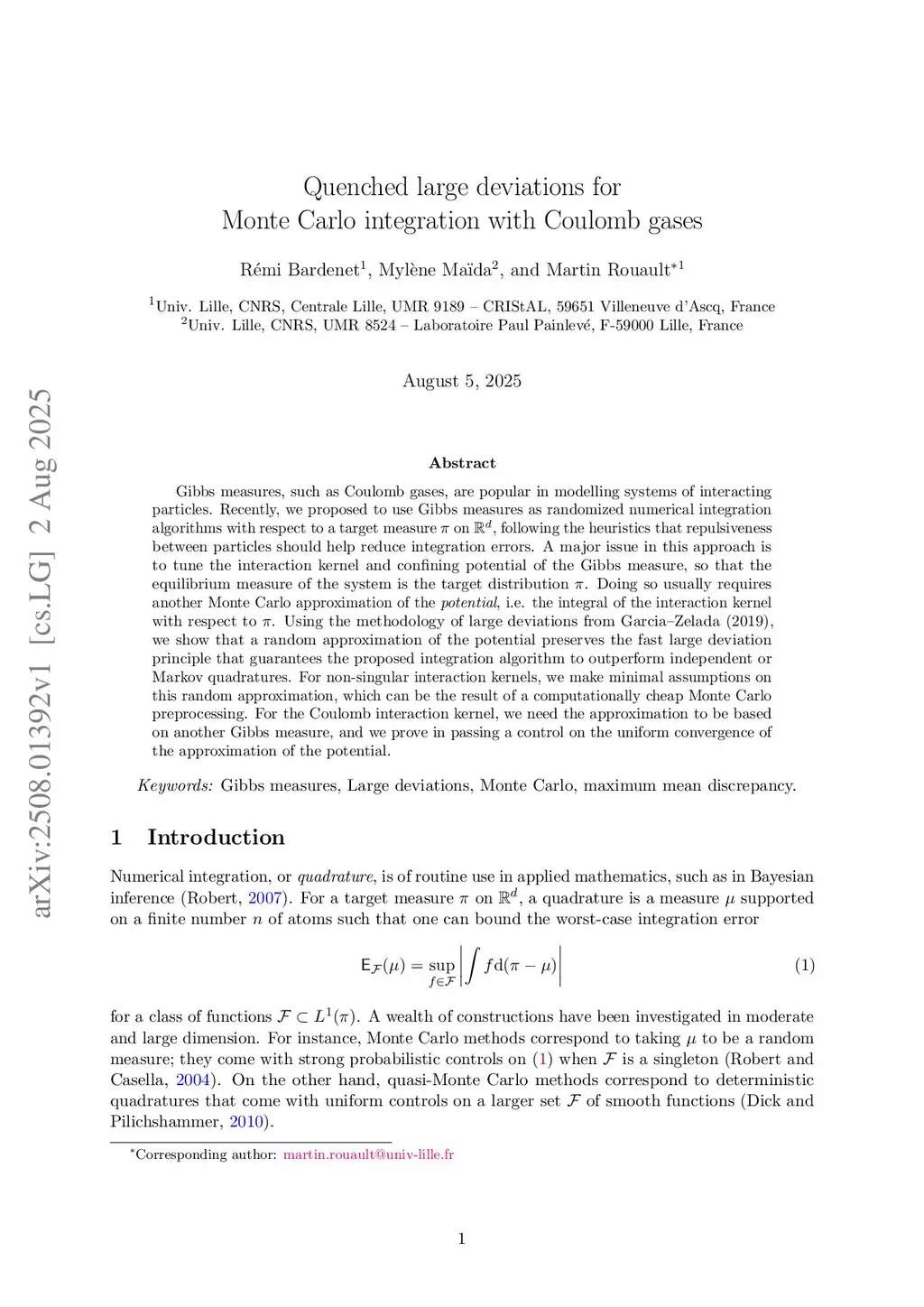 Gibbs measures, such as Coulomb gases, are popular in modelling systems of interacting particles. Recently, we proposed to use Gibbs measures as randomized numerical integration algorithms with respect to a target measure on , following the heuristics that repulsiveness between particles should help reduce integration errors. A major issue in this approach is to tune the interaction kernel and confining potential of the Gibbs measure, so that the equilibrium measure of the system is the target distribution . Doing so usually requires another Monte Carlo approximation of the \emph{potential}, i.e. the integral of the interaction kernel with respect to . Using the methodology of large deviations from Garcia--Zelada (2019), we show that a random approximation of the potential preserves the fast large deviation principle that guarantees the proposed integration algorithm to outperform independent or Markov quadratures. For non-singular interaction kernels, we make minimal assumptions on this random approximation, which can be the result of a computationally cheap Monte Carlo preprocessing. For the Coulomb interaction kernel, we need the approximation to be based on another Gibbs measure, and we prove in passing a control on the uniform convergence of the approximation of the potential.