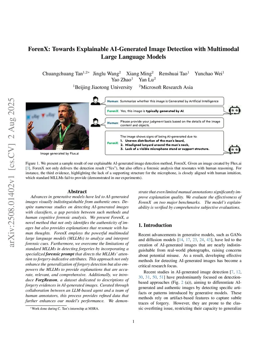 Advances in generative models have led to AI-generated images visually indistinguishable from authentic ones. Despite numerous studies on detecting AI-generated images with classifiers, a gap persists between such methods and human cognitive forensic analysis. We present ForenX, a novel method that not only identifies the authenticity of images but also provides explanations that resonate with human thoughts. ForenX employs the powerful multimodal large language models (MLLMs) to analyze and interpret forensic cues. Furthermore, we overcome the limitations of standard MLLMs in detecting forgeries by incorporating a specialized forensic prompt that directs the MLLMs attention to forgery-indicative attributes. This approach not only enhance the generalization of forgery detection but also empowers the MLLMs to provide explanations that are accurate, relevant, and comprehensive. Additionally, we introduce ForgReason, a dataset dedicated to descriptions of forgery evidences in AI-generated images. Curated through collaboration between an LLM-based agent and a team of human annotators, this process provides refined data that further enhances our model's performance. We demonstrate that even limited manual annotations significantly improve explanation quality. We evaluate the effectiveness of ForenX on two major benchmarks. The model's explainability is verified by comprehensive subjective evaluations.