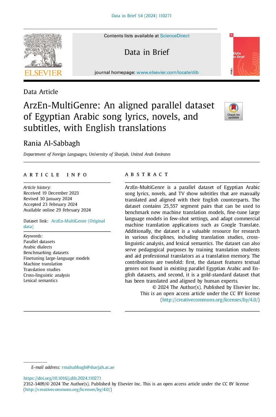 ArzEn-MultiGenre: An aligned parallel dataset of Egyptian Arabic song lyrics, novels, and subtitles, with English translations