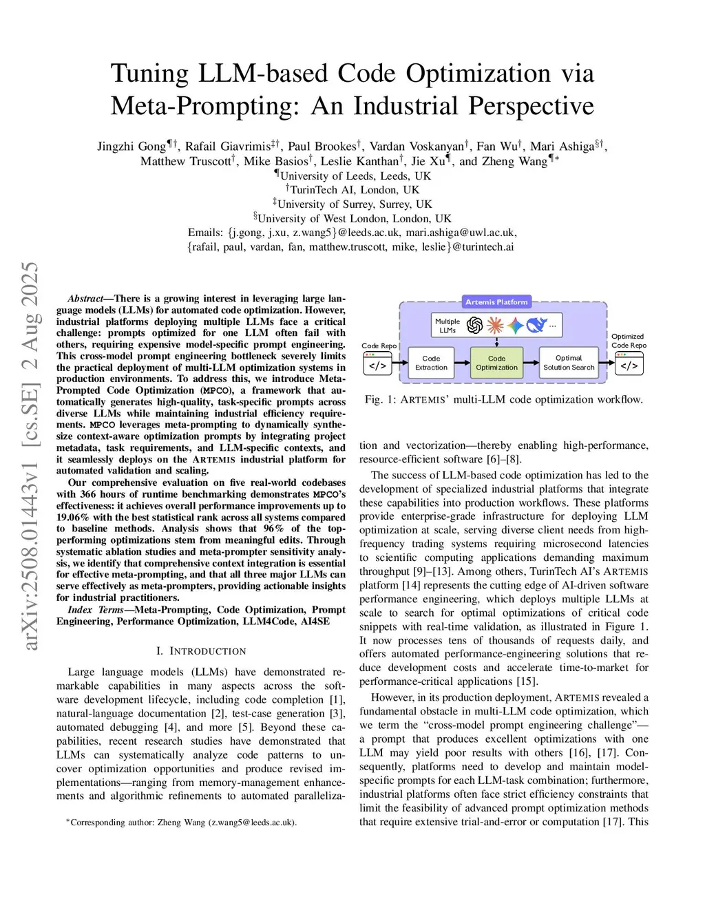 There is a growing interest in leveraging multiple large language models (LLMs) for automated code optimization. However, industrial platforms deploying multiple LLMs face a critical challenge: prompts optimized for one LLM often fail with others, requiring expensive model-specific prompt engineering. This cross-model prompt engineering bottleneck severely limits the practical deployment of multi-LLM systems in production environments. We introduce Meta-Prompted Code Optimization (MPCO), a framework that automatically generates high-quality, task-specific prompts across diverse LLMs while maintaining industrial efficiency requirements. MPCO leverages metaprompting to dynamically synthesize context-aware optimization prompts by integrating project metadata, task requirements, and LLM-specific contexts. It is an essential part of the ARTEMIS code optimization platform for automated validation and scaling. Our comprehensive evaluation on five real-world codebases with 366 hours of runtime benchmarking demonstrates MPCO's effectiveness: it achieves overall performance improvements up to 19.06% with the best statistical rank across all systems compared to baseline methods. Analysis shows that 96% of the top-performing optimizations stem from meaningful edits. Through systematic ablation studies and meta-prompter sensitivity analysis, we identify that comprehensive context integration is essential for effective meta-prompting and that major LLMs can serve effectively as meta-prompters, providing actionable insights for industrial practitioners.