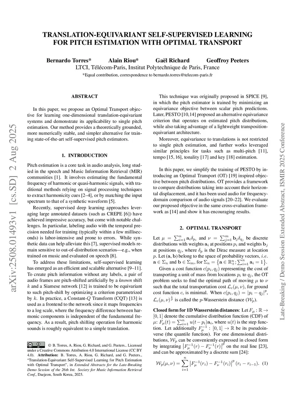 In this paper, we propose an Optimal Transport objective for learning one-dimensional translation-equivariant systems and demonstrate its applicability to single pitch estimation. Our method provides a theoretically grounded, more numerically stable, and simpler alternative for training state-of-the-art self-supervised pitch estimators.