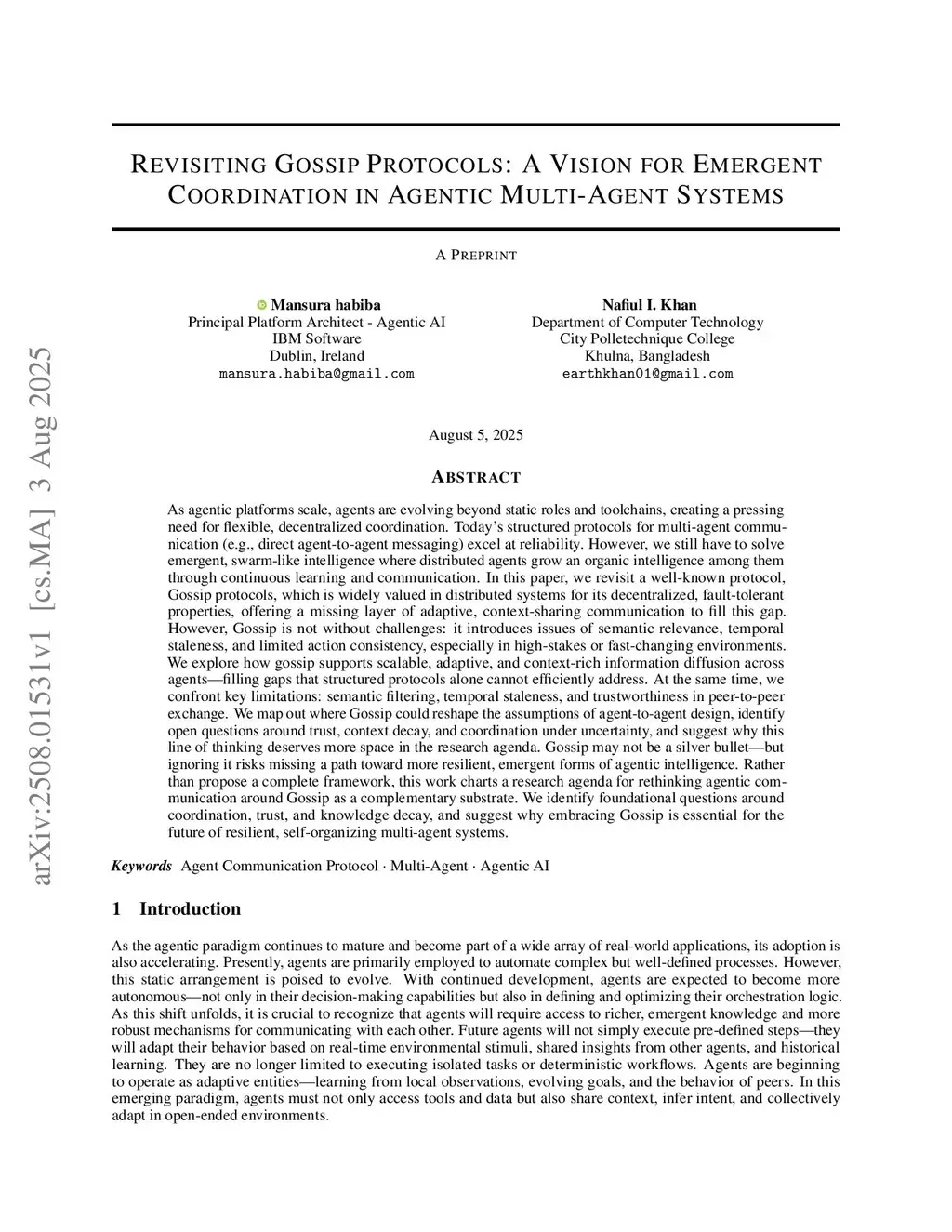 As agentic platforms scale, agents are evolving beyond static roles and fixed toolchains, creating a growing need for flexible, decentralized coordination. Today's structured communication protocols (e.g., direct agent-to-agent messaging) excel at reliability and task delegation, but they fall short in enabling emergent, swarm-like intelligence, where distributed agents continuously learn, adapt, and communicate to form collective cognition. This paper revisits gossip protocols, long valued in distributed systems for their fault tolerance and decentralization, and argues that they offer a missing layer for context-rich, adaptive communication in agentic AI. Gossip enables scalable, low-overhead dissemination of shared knowledge, but also raises unresolved challenges around semantic filtering, staleness, trustworthiness, and consistency in high-stakes environments. Rather than proposing a new framework, this work charts a research agenda for integrating gossip as a complementary substrate alongside structured protocols. We identify critical gaps in current agent-to-agent architectures, highlight where gossip could reshape assumptions about coordination, and outline open questions around intent propagation, knowledge decay, and peer-to-peer trust. Gossip is not a silver bullet, but overlooking it risks missing a key path toward resilient, reflexive, and self-organizing multi-agent systems.