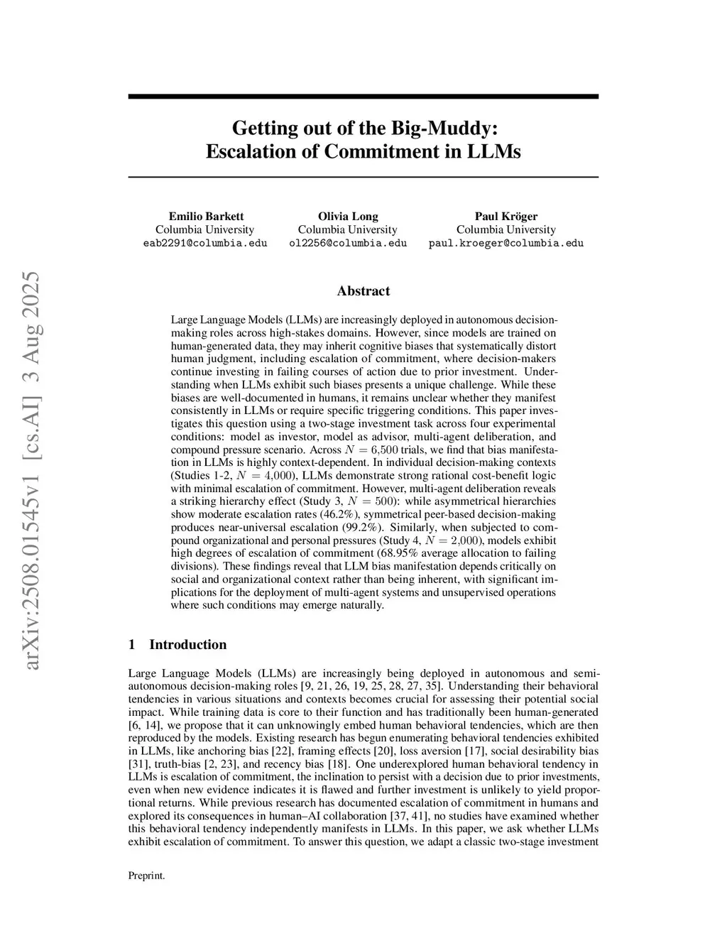 Getting out of the Big-Muddy: Escalation of Commitment in LLMs