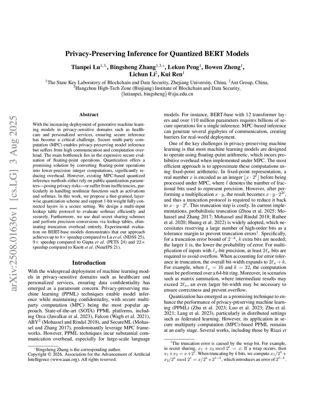 With the increasing deployment of generative machine learning models in privacy-sensitive domains such as healthcare and personalized services, ensuring secure inference has become a critical challenge. Secure multi-party computation (MPC) enables privacy-preserving model inference but suffers from high communication and computation overhead. The main bottleneck lies in the expensive secure evaluation of floating-point operations. Quantization offers a promising solution by converting floating-point operations into lower-precision integer computations, significantly reducing overhead. However, existing MPC-based quantized inference methods either rely on public quantization parameters-posing privacy risks-or suffer from inefficiencies, particularly in handling nonlinear functions such as activations and softmax. In this work, we propose a fine-grained, layer-wise quantization scheme and support 1-bit weight fully connected layers in a secure setting. We design a multi-input lookup table protocol to evaluate softmax efficiently and securely. Furthermore, we use dual secret sharing schemes and perform precision conversions via lookup tables, eliminating truncation overhead entirely. Experimental evaluation on BERT-base models demonstrates that our approach achieves up to speedup compared to Lu \emph{et al}. (NDSS 25), speedup compared to Gupta \emph{et al}. (PETS 24) and speedup compared to Knott \emph{et al}. (NeurIPS 21).