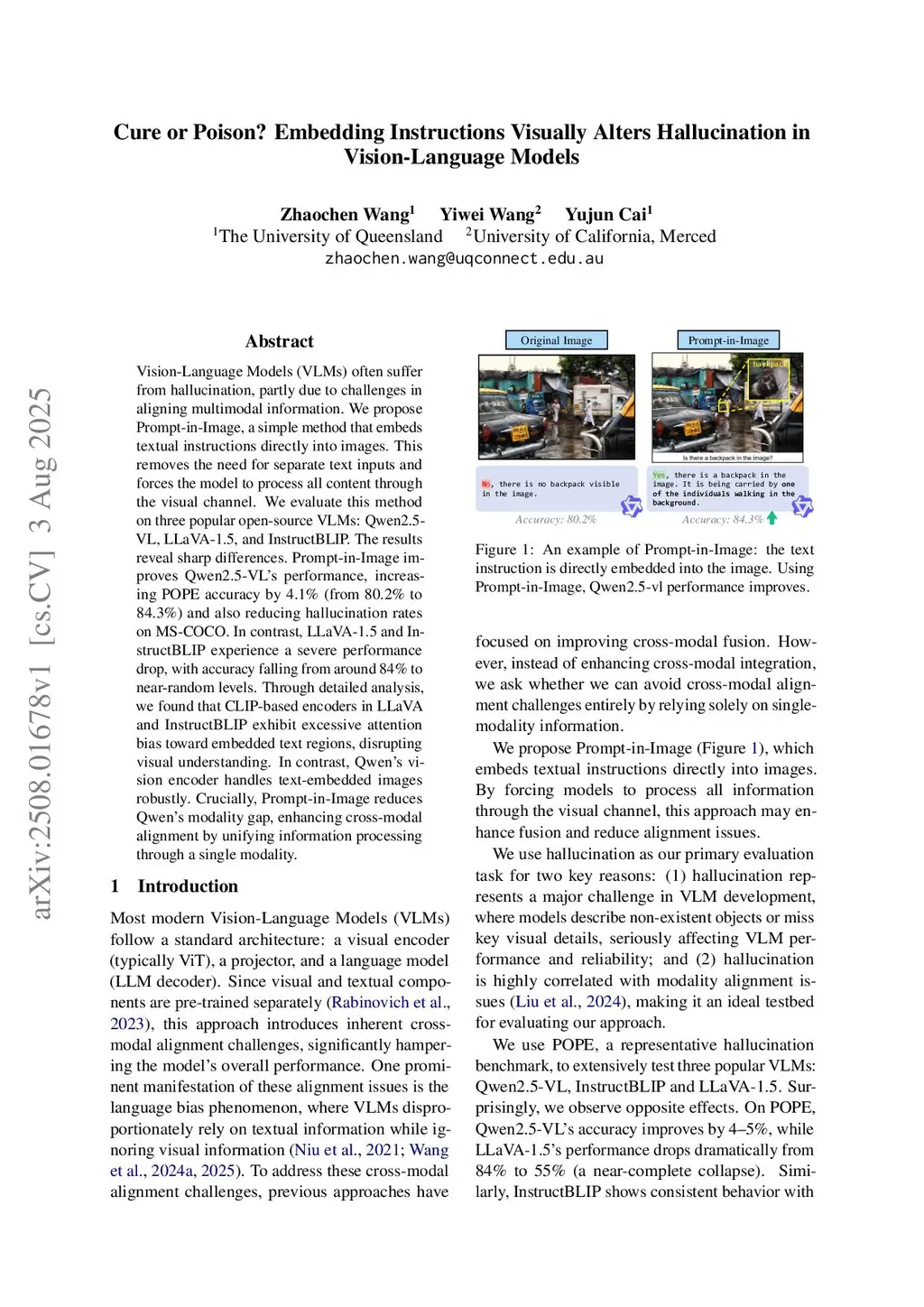 Vision-Language Models (VLMs) often suffer from hallucination, partly due to challenges in aligning multimodal information. We propose Prompt-in-Image, a simple method that embeds textual instructions directly into images. This removes the need for separate text inputs and forces the model to process all content through the visual channel. We evaluate this method on three popular open-source VLMs: Qwen2.5-VL, LLaVA-1.5, and InstructBLIP. The results reveal sharp differences. Prompt-in-Image improves Qwen2.5-VL's performance, increasing POPE accuracy by 4.1 percent (from 80.2 percent to 84.3 percent) and also reducing hallucination rates on MS-COCO. In contrast, LLaVA-1.5 and InstructBLIP experience a severe performance drop, with accuracy falling from around 84 percent to near-random levels. Through detailed analysis, we found that CLIP-based encoders in LLaVA and InstructBLIP exhibit excessive attention bias toward embedded text regions, disrupting visual understanding. In contrast, Qwen's vision encoder handles text-embedded images robustly. Crucially, Prompt-in-Image reduces Qwen's modality gap, enhancing cross-modal alignment by unifying information processing through a single modality.