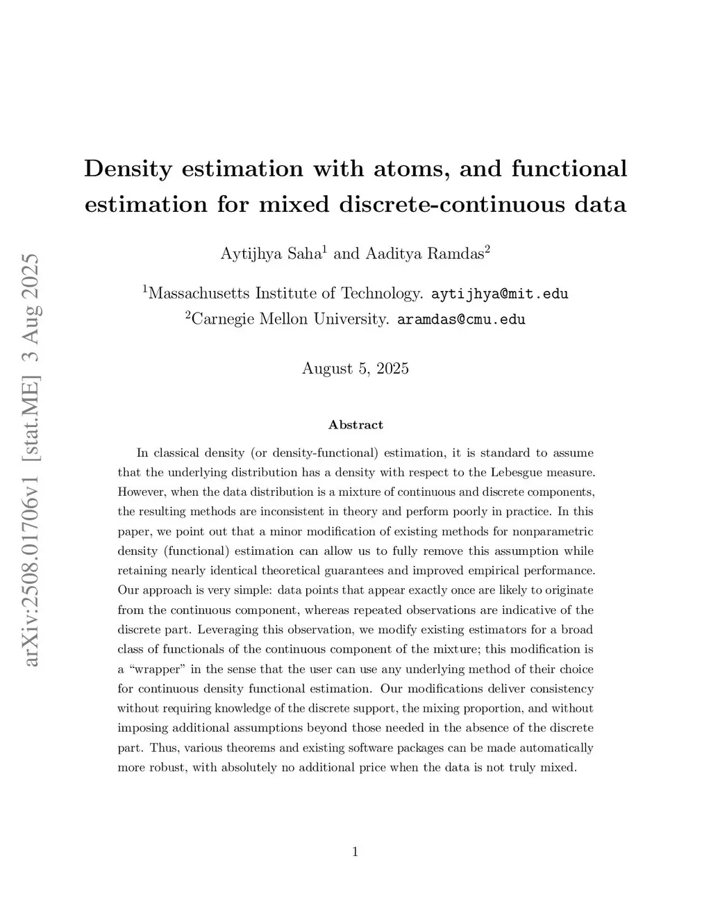 Density estimation with atoms, and functional estimation for mixed discrete-continuous data