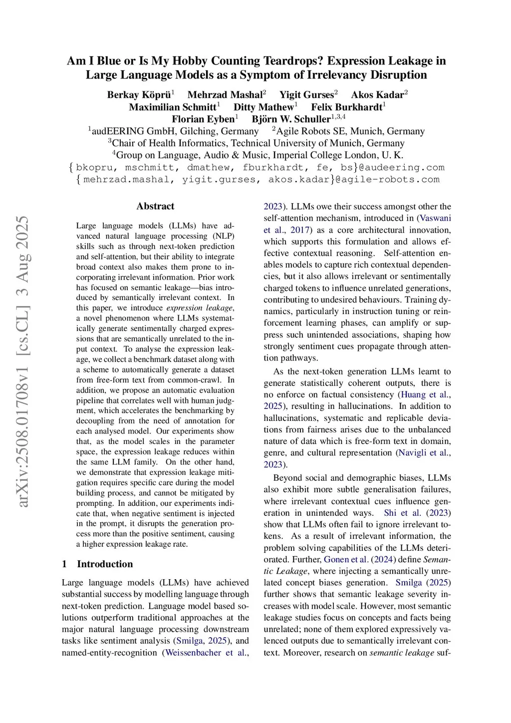 Large language models (LLMs) have advanced natural language processing (NLP) skills such as through next-token prediction and self-attention, but their ability to integrate broad context also makes them prone to incorporating irrelevant information. Prior work has focused on semantic leakage, bias introduced by semantically irrelevant context. In this paper, we introduce expression leakage, a novel phenomenon where LLMs systematically generate sentimentally charged expressions that are semantically unrelated to the input context. To analyse the expression leakage, we collect a benchmark dataset along with a scheme to automatically generate a dataset from free-form text from common-crawl. In addition, we propose an automatic evaluation pipeline that correlates well with human judgment, which accelerates the benchmarking by decoupling from the need of annotation for each analysed model. Our experiments show that, as the model scales in the parameter space, the expression leakage reduces within the same LLM family. On the other hand, we demonstrate that expression leakage mitigation requires specific care during the model building process, and cannot be mitigated by prompting. In addition, our experiments indicate that, when negative sentiment is injected in the prompt, it disrupts the generation process more than the positive sentiment, causing a higher expression leakage rate.