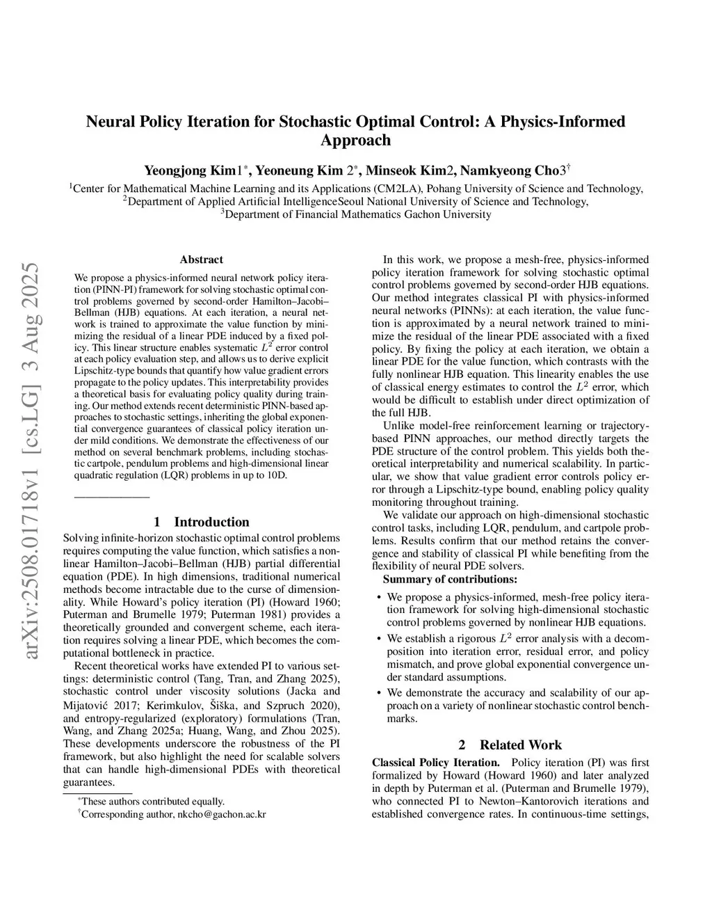 Neural Policy Iteration for Stochastic Optimal Control: A Physics-Informed Approach