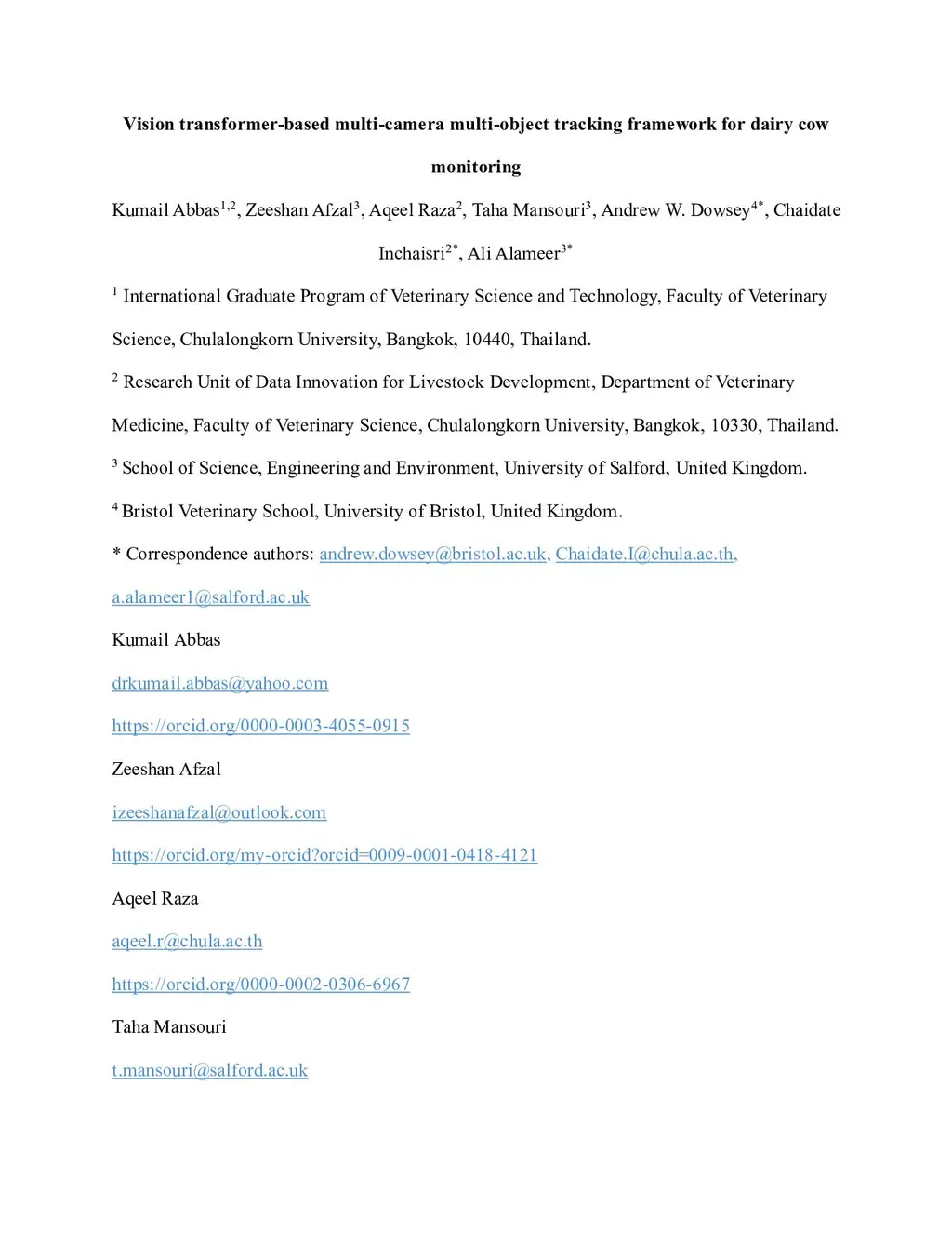 Vision transformer-based multi-camera multi-object tracking framework for dairy cow monitoring