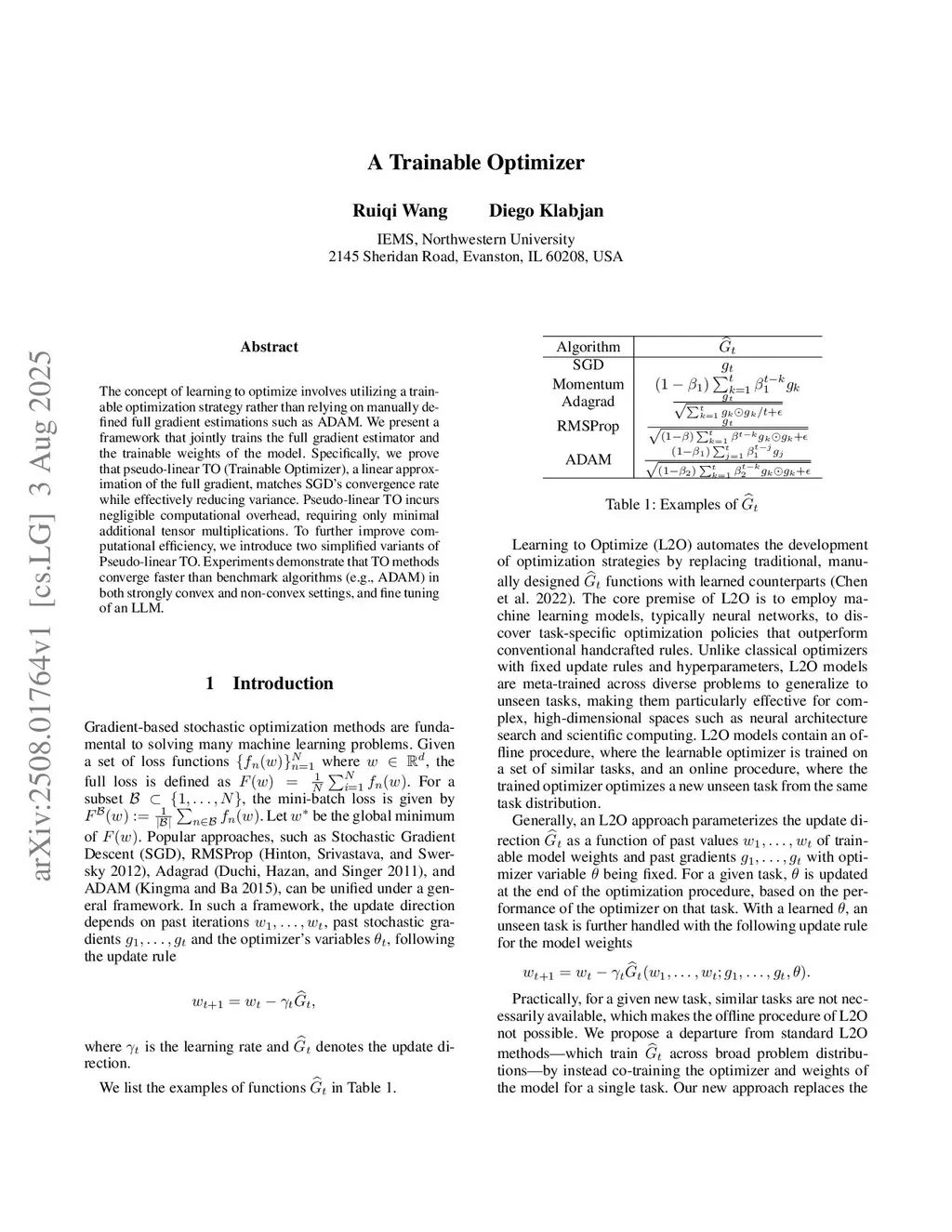 The concept of learning to optimize involves utilizing a trainable optimization strategy rather than relying on manually defined full gradient estimations such as ADAM. We present a framework that jointly trains the full gradient estimator and the trainable weights of the model. Specifically, we prove that pseudo-linear TO (Trainable Optimizer), a linear approximation of the full gradient, matches SGD's convergence rate while effectively reducing variance. Pseudo-linear TO incurs negligible computational overhead, requiring only minimal additional tensor multiplications. To further improve computational efficiency, we introduce two simplified variants of Pseudo-linear TO. Experiments demonstrate that TO methods converge faster than benchmark algorithms (e.g., ADAM) in both strongly convex and non-convex settings, and fine tuning of an LLM.