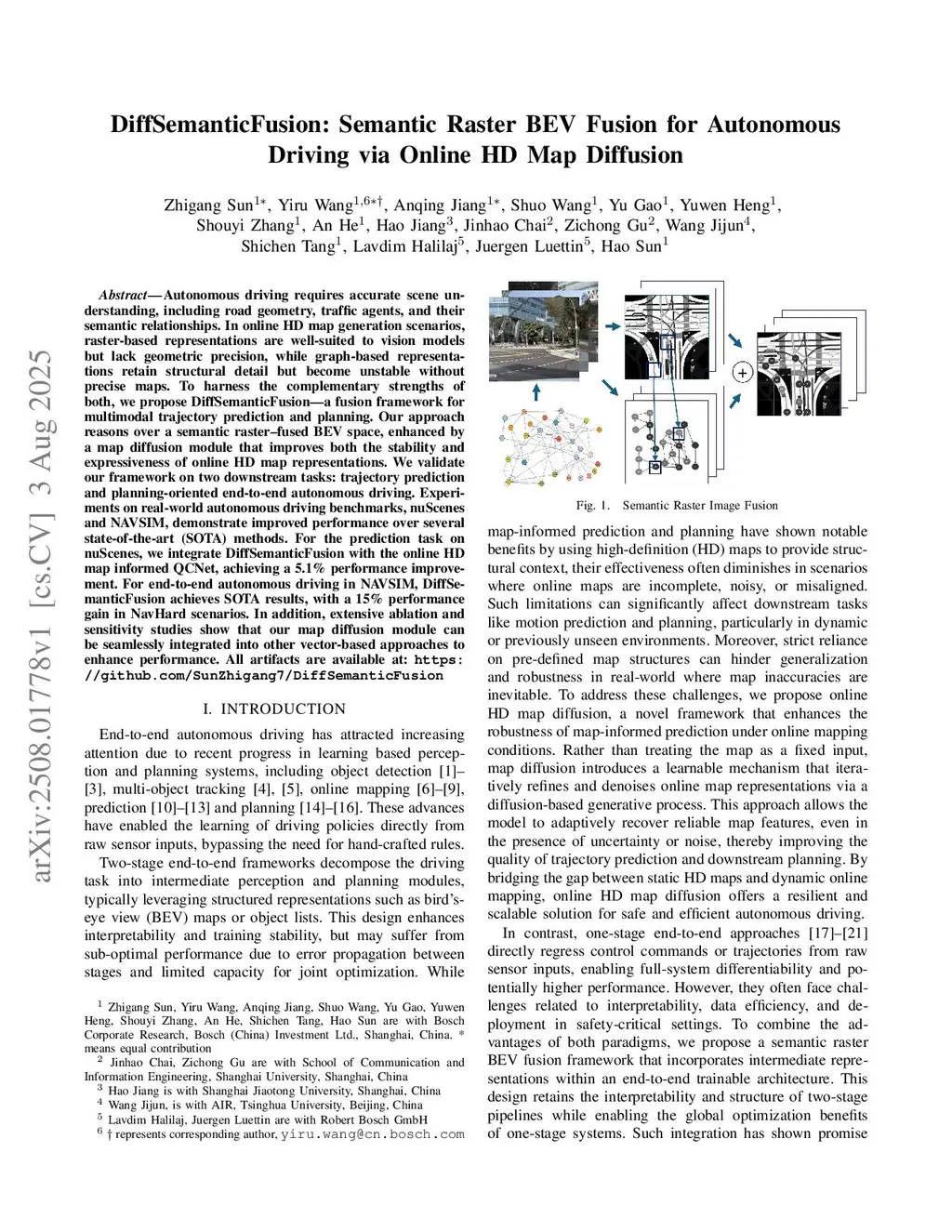 DiffSemanticFusion: Semantic Raster BEV Fusion for Autonomous Driving via Online HD Map Diffusion