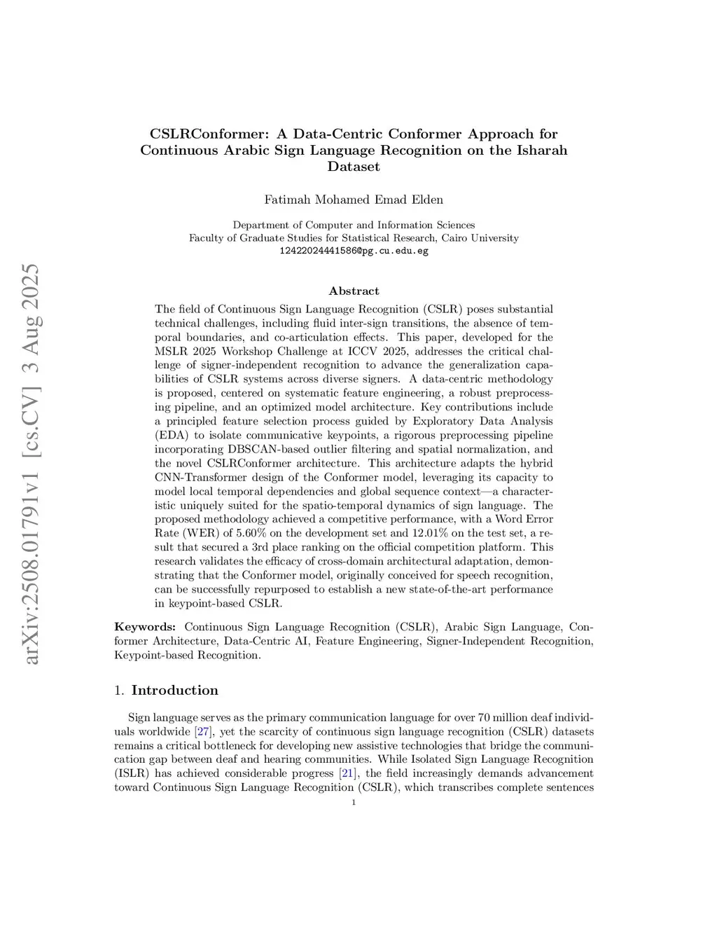 The field of Continuous Sign Language Recognition (CSLR) poses substantial technical challenges, including fluid inter-sign transitions, the absence of temporal boundaries, and co-articulation effects. This paper, developed for the MSLR 2025 Workshop Challenge at ICCV 2025, addresses the critical challenge of signer-independent recognition to advance the generalization capabilities of CSLR systems across diverse signers. A data-centric methodology is proposed, centered on systematic feature engineering, a robust preprocessing pipeline, and an optimized model architecture. Key contributions include a principled feature selection process guided by Exploratory Data Analysis (EDA) to isolate communicative keypoints, a rigorous preprocessing pipeline incorporating DBSCAN-based outlier filtering and spatial normalization, and the novel CSLRConformer architecture. This architecture adapts the hybrid CNN-Transformer design of the Conformer model, leveraging its capacity to model local temporal dependencies and global sequence context; a characteristic uniquely suited for the spatio-temporal dynamics of sign language. The proposed methodology achieved a competitive performance, with a Word Error Rate (WER) of 5.60% on the development set and 12.01% on the test set, a result that secured a 3rd place ranking on the official competition platform. This research validates the efficacy of cross-domain architectural adaptation, demonstrating that the Conformer model, originally conceived for speech recognition, can be successfully repurposed to establish a new state-of-the-art performance in keypoint-based CSLR.