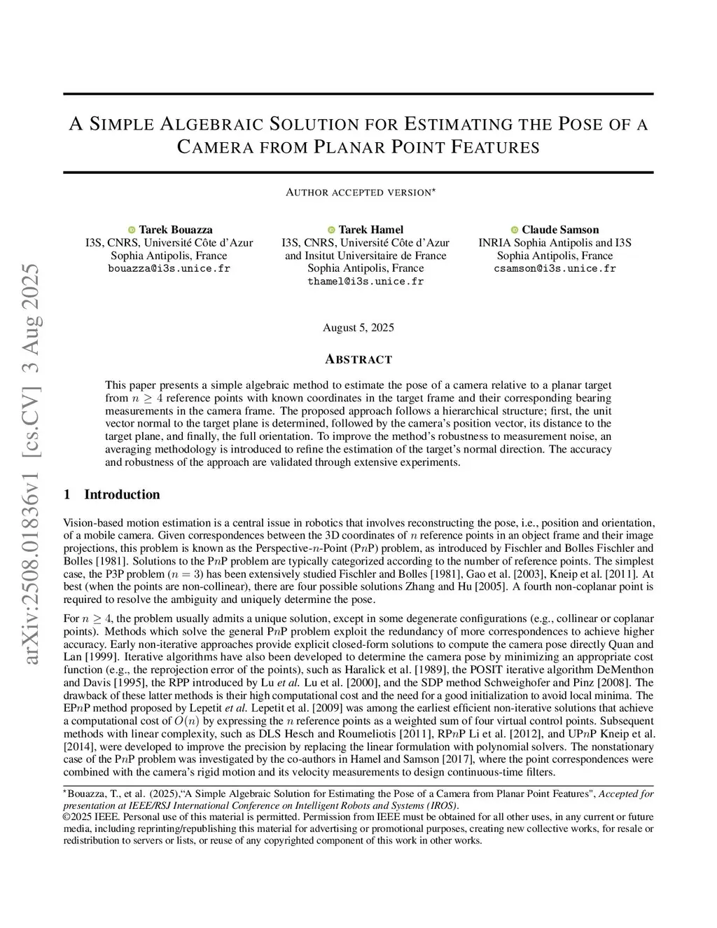A Simple Algebraic Solution for Estimating the Pose of a Camera from Planar Point Features