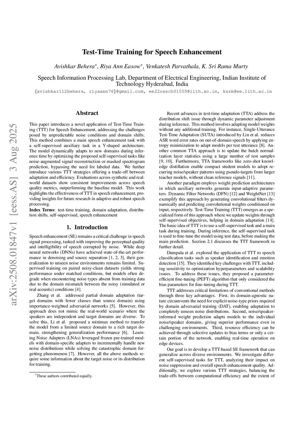 This paper introduces a novel application of Test-Time Training (TTT) for Speech Enhancement, addressing the challenges posed by unpredictable noise conditions and domain shifts. This method combines a main speech enhancement task with a self-supervised auxiliary task in a Y-shaped architecture. The model dynamically adapts to new domains during inference time by optimizing the proposed self-supervised tasks like noise-augmented signal reconstruction or masked spectrogram prediction, bypassing the need for labeled data. We further introduce various TTT strategies offering a trade-off between adaptation and efficiency. Evaluations across synthetic and real-world datasets show consistent improvements across speech quality metrics, outperforming the baseline model. This work highlights the effectiveness of TTT in speech enhancement, providing insights for future research in adaptive and robust speech processing.