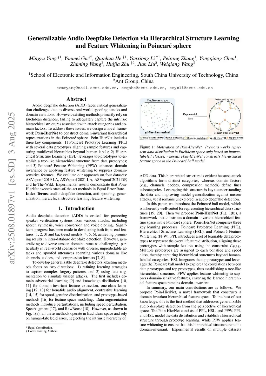 Generalizable Audio Deepfake Detection via Hierarchical Structure Learning and Feature Whitening in Poincaré sphere