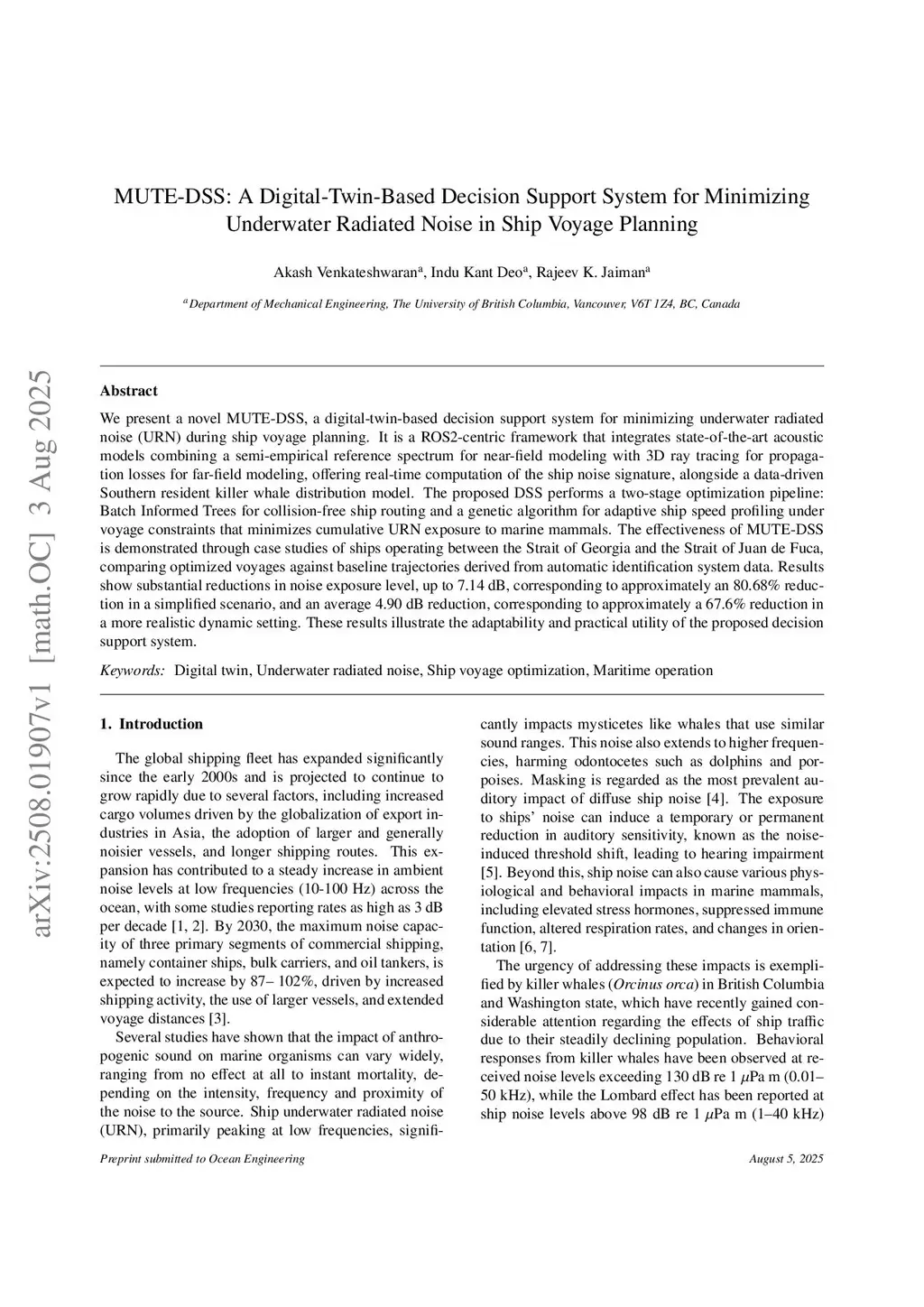 We present a novel MUTE-DSS, a digital-twin-based decision support system for minimizing underwater radiated noise (URN) during ship voyage planning. It is a ROS2-centric framework that integrates state-of-the-art acoustic models combining a semi-empirical reference spectrum for near-field modeling with 3D ray tracing for propagation losses for far-field modeling, offering real-time computation of the ship noise signature, alongside a data-driven Southern resident killer whale distribution model. The proposed DSS performs a two-stage optimization pipeline: Batch Informed Trees for collision-free ship routing and a genetic algorithm for adaptive ship speed profiling under voyage constraints that minimizes cumulative URN exposure to marine mammals. The effectiveness of MUTE-DSS is demonstrated through case studies of ships operating between the Strait of Georgia and the Strait of Juan de Fuca, comparing optimized voyages against baseline trajectories derived from automatic identification system data. Results show substantial reductions in noise exposure level, up to 7.14 dB, corresponding to approximately an 80.68% reduction in a simplified scenario, and an average 4.90 dB reduction, corresponding to approximately a 67.6% reduction in a more realistic dynamic setting. These results illustrate the adaptability and practical utility of the proposed decision support system.