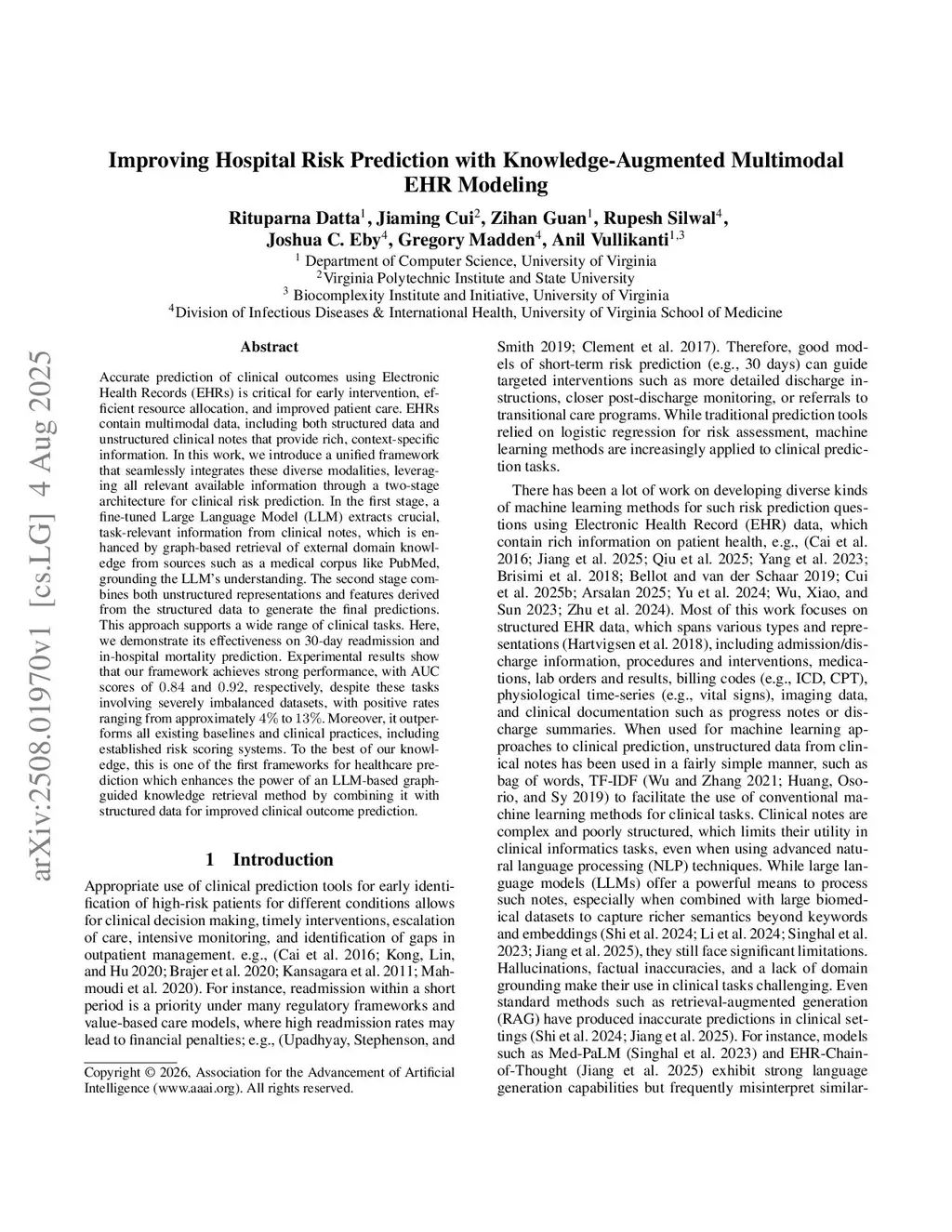 Accurate prediction of clinical outcomes using Electronic Health Records (EHRs) is critical for early intervention, efficient resource allocation, and improved patient care. EHRs contain multimodal data, including both structured data and unstructured clinical notes that provide rich, context-specific information. In this work, we introduce a unified framework that seamlessly integrates these diverse modalities, leveraging all relevant available information through a two-stage architecture for clinical risk prediction. In the first stage, a fine-tuned Large Language Model (LLM) extracts crucial, task-relevant information from clinical notes, which is enhanced by graph-based retrieval of external domain knowledge from sources such as a medical corpus like PubMed, grounding the LLM's understanding. The second stage combines both unstructured representations and features derived from the structured data to generate the final predictions. This approach supports a wide range of clinical tasks. Here, we demonstrate its effectiveness on 30-day readmission and in-hospital mortality prediction. Experimental results show that our framework achieves strong performance, with AUC scores of and , respectively, despite these tasks involving severely imbalanced datasets, with positive rates ranging from approximately to . Moreover, it outperforms all existing baselines and clinical practices, including established risk scoring systems. To the best of our knowledge, this is one of the first frameworks for healthcare prediction which enhances the power of an LLM-based graph-guided knowledge retrieval method by combining it with structured data for improved clinical outcome prediction.