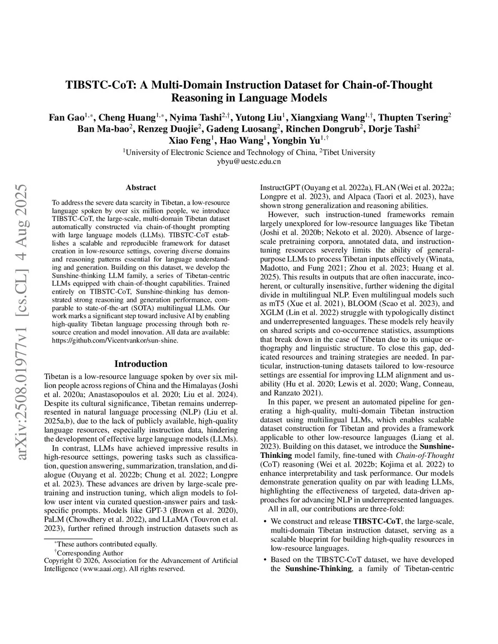 To address the severe data scarcity in Tibetan, a low-resource language spoken by over six million people, we introduce TIBSTC-CoT, the large-scale, multi-domain Tibetan dataset automatically constructed via chain-of-thought prompting with large language models (LLMs). TIBSTC-CoT establishes a scalable and reproducible framework for dataset creation in low-resource settings, covering diverse domains and reasoning patterns essential for language understanding and generation. Building on this dataset, we develop the Sunshine-thinking LLM family, a series of Tibetan-centric LLMs equipped with chain-of-thought capabilities. Trained entirely on TIBSTC-CoT, Sunshine-thinking has demonstrated strong reasoning and generation performance, comparable to state-of-the-art (SOTA) multilingual LLMs. Our work marks a significant step toward inclusive AI by enabling high-quality Tibetan language processing through both resource creation and model innovation. All data are available:this https URL.