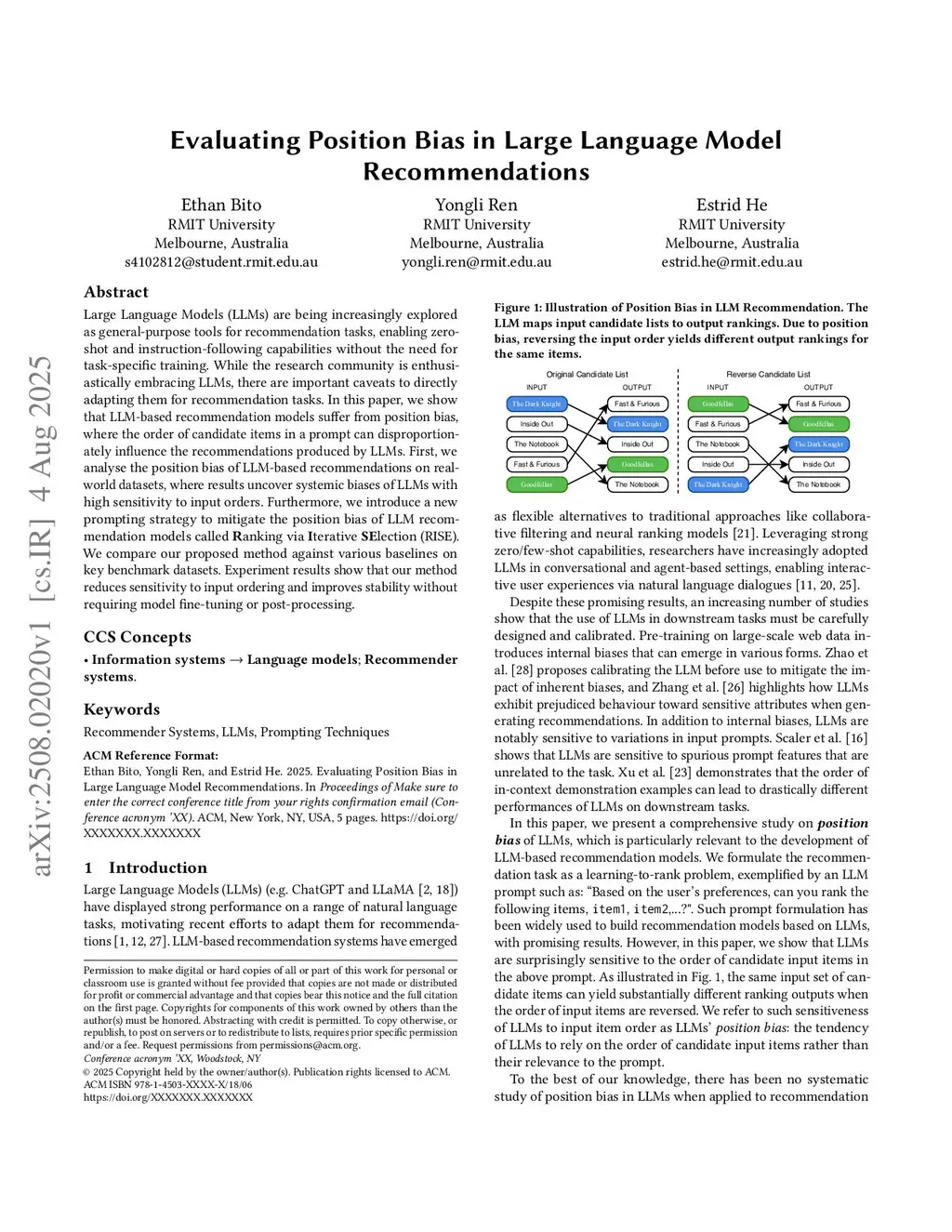 Large Language Models (LLMs) are being increasingly explored as general-purpose tools for recommendation tasks, enabling zero-shot and instruction-following capabilities without the need for task-specific training. While the research community is enthusiastically embracing LLMs, there are important caveats to directly adapting them for recommendation tasks. In this paper, we show that LLM-based recommendation models suffer from position bias, where the order of candidate items in a prompt can disproportionately influence the recommendations produced by LLMs. First, we analyse the position bias of LLM-based recommendations on real-world datasets, where results uncover systemic biases of LLMs with high sensitivity to input orders. Furthermore, we introduce a new prompting strategy to mitigate the position bias of LLM recommendation models called Ranking via Iterative SElection (RISE). We compare our proposed method against various baselines on key benchmark datasets. Experiment results show that our method reduces sensitivity to input ordering and improves stability without requiring model fine-tuning or post-processing.