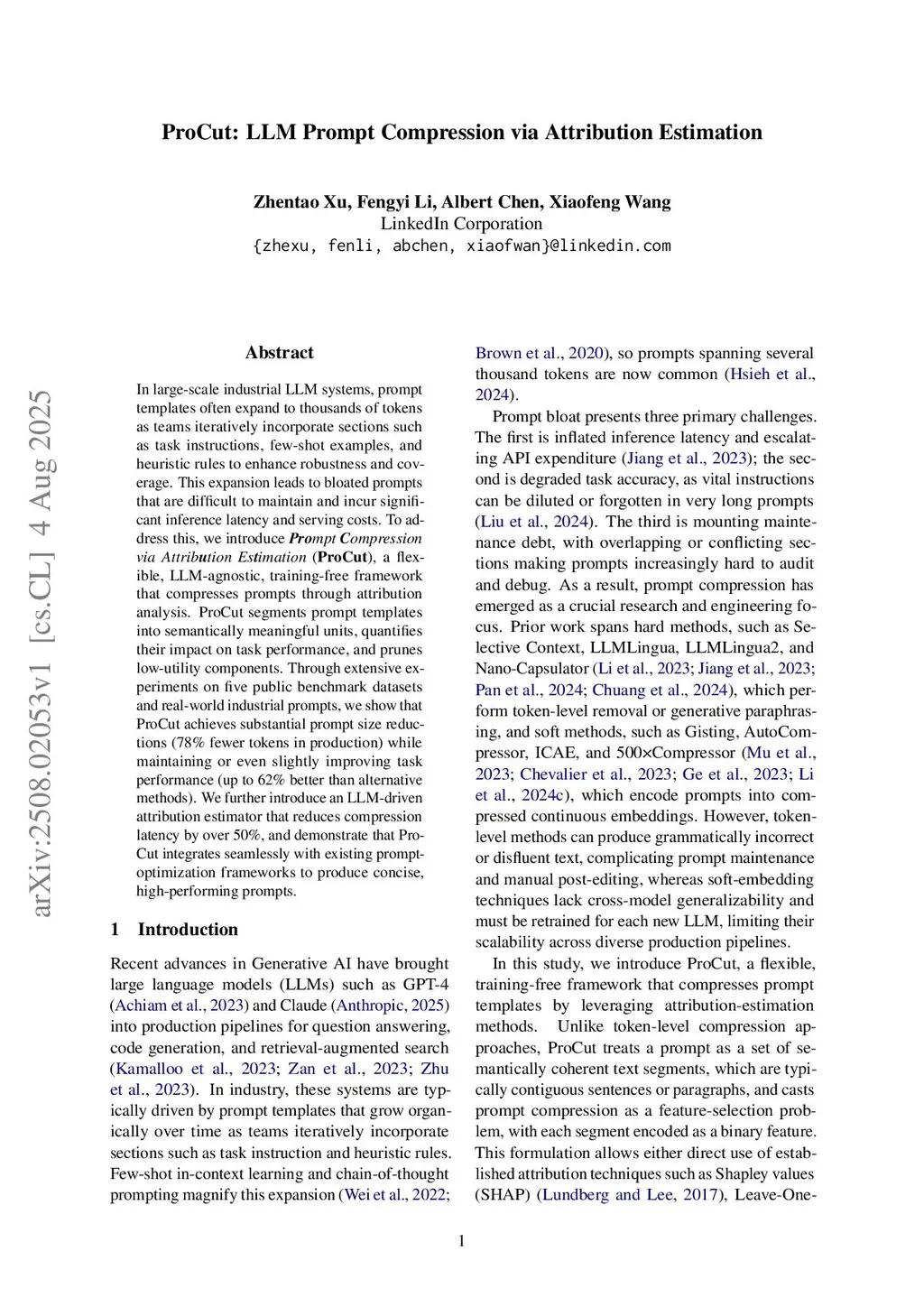 In large-scale industrial LLM systems, prompt templates often expand to thousands of tokens as teams iteratively incorporate sections such as task instructions, few-shot examples, and heuristic rules to enhance robustness and coverage. This expansion leads to bloated prompts that are difficult to maintain and incur significant inference latency and serving costs. To address this, we introduce Prompt Compression via Attribution Estimation (ProCut), a flexible, LLM-agnostic, training-free framework that compresses prompts through attribution analysis. ProCut segments prompt templates into semantically meaningful units, quantifies their impact on task performance, and prunes low-utility components. Through extensive experiments on five public benchmark datasets and real-world industrial prompts, we show that ProCut achieves substantial prompt size reductions (78% fewer tokens in production) while maintaining or even slightly improving task performance (up to 62% better than alternative methods). We further introduce an LLM-driven attribution estimator that reduces compression latency by over 50%, and demonstrate that ProCut integrates seamlessly with existing prompt-optimization frameworks to produce concise, high-performing prompts.