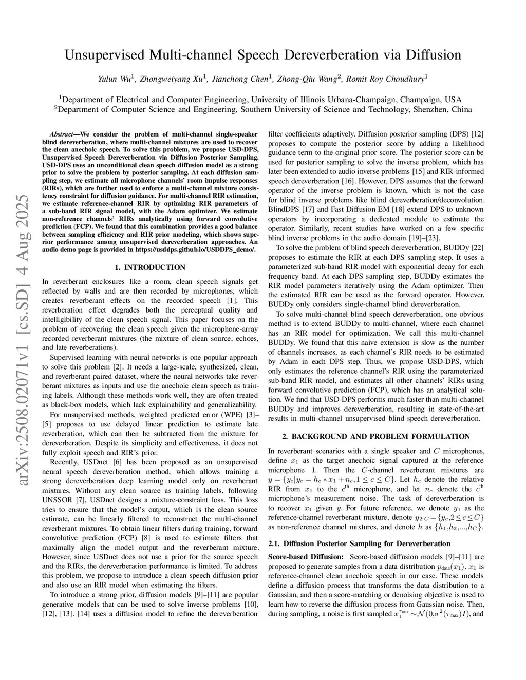 We consider the problem of multi-channel single-speaker blind dereverberation, where multi-channel mixtures are used to recover the clean anechoic speech. To solve this problem, we propose USD-DPS, {U}nsupervised {S}peech {D}ereverberation via {D}iffusion {P}osterior {S}ampling. USD-DPS uses an unconditional clean speech diffusion model as a strong prior to solve the problem by posterior sampling. At each diffusion sampling step, we estimate all microphone channels' room impulse responses (RIRs), which are further used to enforce a multi-channel mixture consistency constraint for diffusion guidance. For multi-channel RIR estimation, we estimate reference-channel RIR by optimizing RIR parameters of a sub-band RIR signal model, with the Adam optimizer. We estimate non-reference channels' RIRs analytically using forward convolutive prediction (FCP). We found that this combination provides a good balance between sampling efficiency and RIR prior modeling, which shows superior performance among unsupervised dereverberation approaches. An audio demo page is provided inthis https URL.