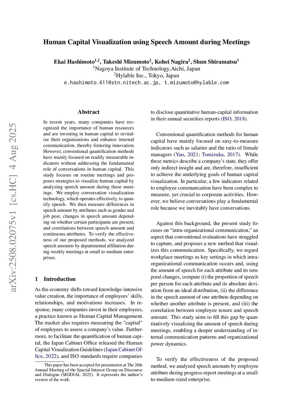 In recent years, many companies have recognized the importance of human resources and are investing in human capital to revitalize their organizations and enhance internal communication, thereby fostering innovation. However, conventional quantification methods have mainly focused on readily measurable indicators without addressing the fundamental role of conversations in human capital. This study focuses on routine meetings and proposes strategies to visualize human capital by analyzing speech amount during these meetings. We employ conversation visualization technology, which operates effectively, to quantify speech. We then measure differences in speech amount by attributes such as gender and job post, changes in speech amount depending on whether certain participants are present, and correlations between speech amount and continuous attributes. To verify the effectiveness of our proposed methods, we analyzed speech amounts by departmental affiliation during weekly meetings at small to medium enterprises.