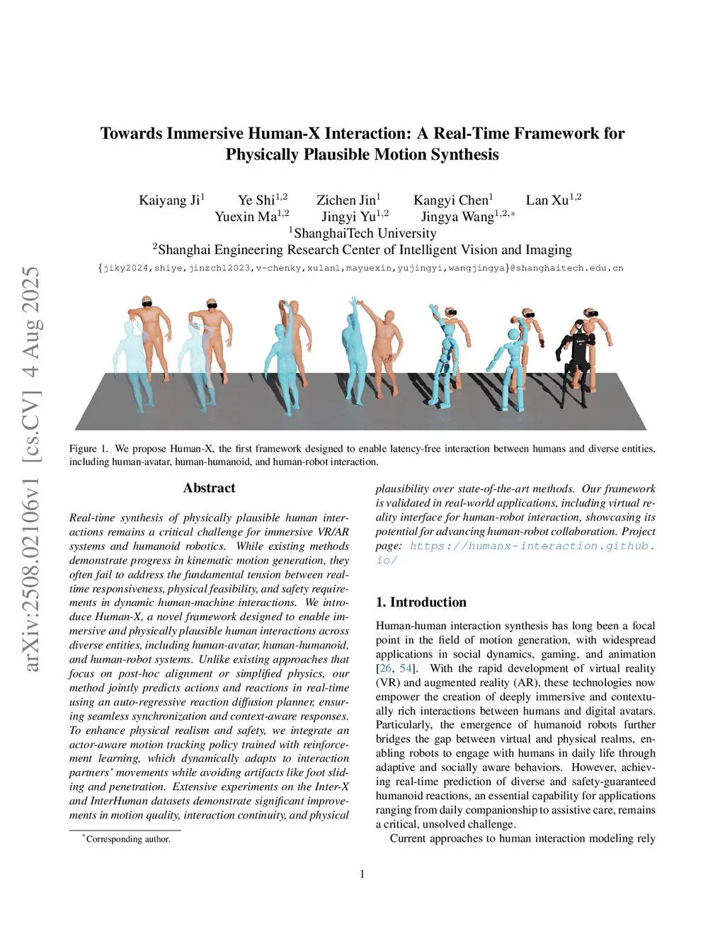 Real-time synthesis of physically plausible human interactions remains a critical challenge for immersive VR/AR systems and humanoid robotics. While existing methods demonstrate progress in kinematic motion generation, they often fail to address the fundamental tension between real-time responsiveness, physical feasibility, and safety requirements in dynamic human-machine interactions. We introduce Human-X, a novel framework designed to enable immersive and physically plausible human interactions across diverse entities, including human-avatar, human-humanoid, and human-robot systems. Unlike existing approaches that focus on post-hoc alignment or simplified physics, our method jointly predicts actions and reactions in real-time using an auto-regressive reaction diffusion planner, ensuring seamless synchronization and context-aware responses. To enhance physical realism and safety, we integrate an actor-aware motion tracking policy trained with reinforcement learning, which dynamically adapts to interaction partners' movements while avoiding artifacts like foot sliding and penetration. Extensive experiments on the Inter-X and InterHuman datasets demonstrate significant improvements in motion quality, interaction continuity, and physical plausibility over state-of-the-art methods. Our framework is validated in real-world applications, including virtual reality interface for human-robot interaction, showcasing its potential for advancing human-robot collaboration.
