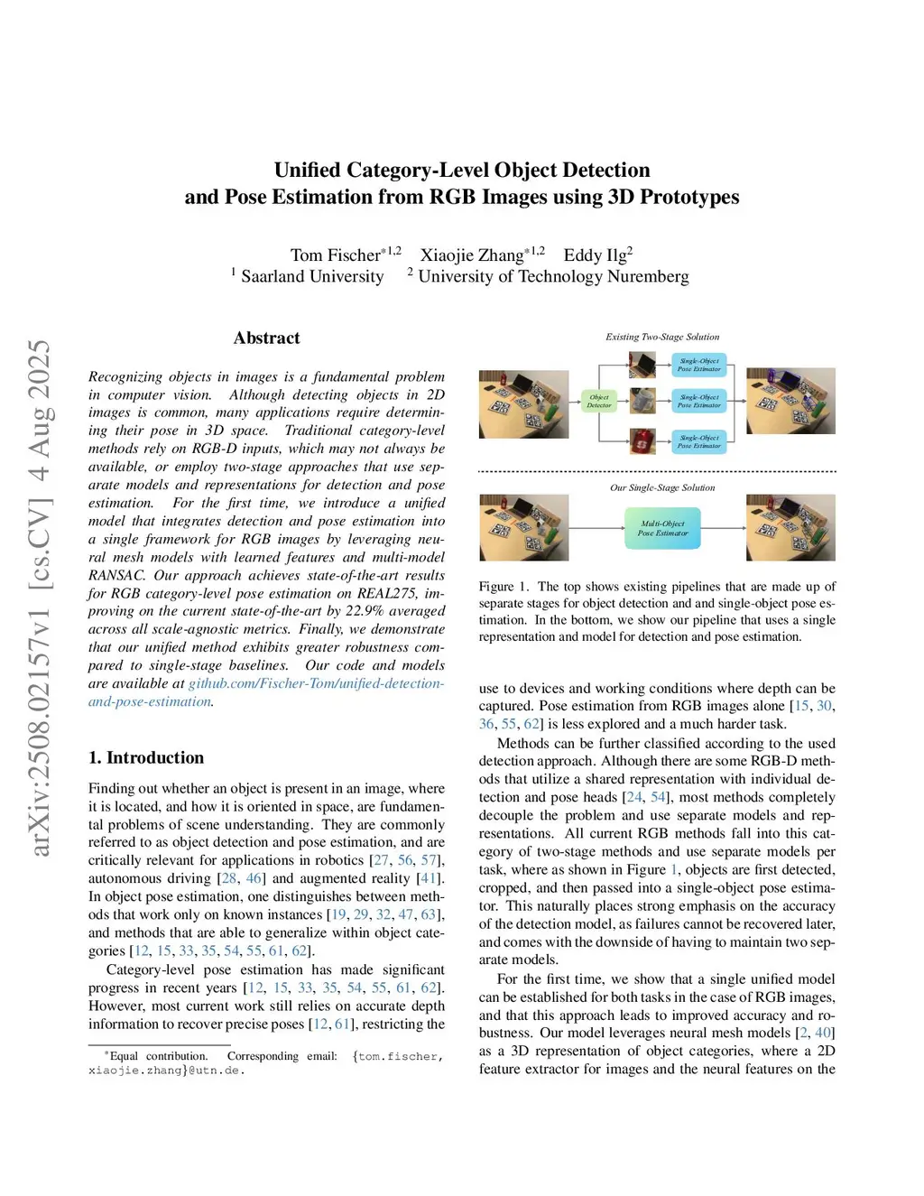 Recognizing objects in images is a fundamental problem in computer vision. Although detecting objects in 2D images is common, many applications require determining their pose in 3D space. Traditional category-level methods rely on RGB-D inputs, which may not always be available, or employ two-stage approaches that use separate models and representations for detection and pose estimation. For the first time, we introduce a unified model that integrates detection and pose estimation into a single framework for RGB images by leveraging neural mesh models with learned features and multi-model RANSAC. Our approach achieves state-of-the-art results for RGB category-level pose estimation on REAL275, improving on the current state-of-the-art by 22.9% averaged across all scale-agnostic metrics. Finally, we demonstrate that our unified method exhibits greater robustness compared to single-stage baselines. Our code and models are available atthis https URL.