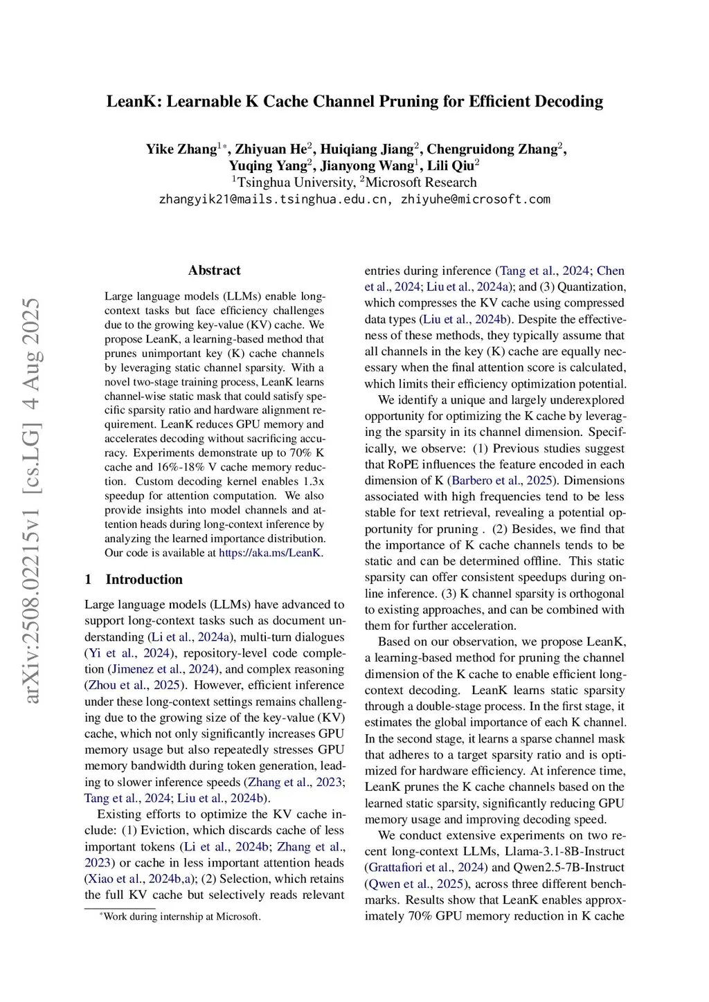 Large language models (LLMs) enable long-context tasks but face efficiency challenges due to the growing key-value (KV) cache. We propose LeanK, a learning-based method that prunes unimportant key (K) cache channels by leveraging static channel sparsity. With a novel two-stage training process, LeanK learns channel-wise static mask that could satisfy specific sparsity ratio and hardware alignment requirement. LeanK reduces GPU memory and accelerates decoding without sacrificing accuracy. Experiments demonstrate up to 70% K cache and 16%-18% V cache memory reduction. Custom decoding kernel enables 1.3x speedup for attention computation. We also provide insights into model channels and attention heads during long-context inference by analyzing the learned importance distribution. Our code is available atthis https URL.