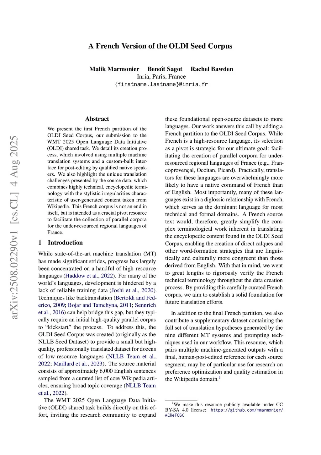We present the first French partition of the OLDI Seed Corpus, our submission to the WMT 2025 Open Language Data Initiative (OLDI) shared task. We detail its creation process, which involved using multiple machine translation systems and a custom-built interface for post-editing by qualified native speakers. We also highlight the unique translation challenges presented by the source data, which combines highly technical, encyclopedic terminology with the stylistic irregularities characteristic of user-generated content taken from Wikipedia. This French corpus is not an end in itself, but is intended as a crucial pivot resource to facilitate the collection of parallel corpora for the under-resourced regional languages of France.