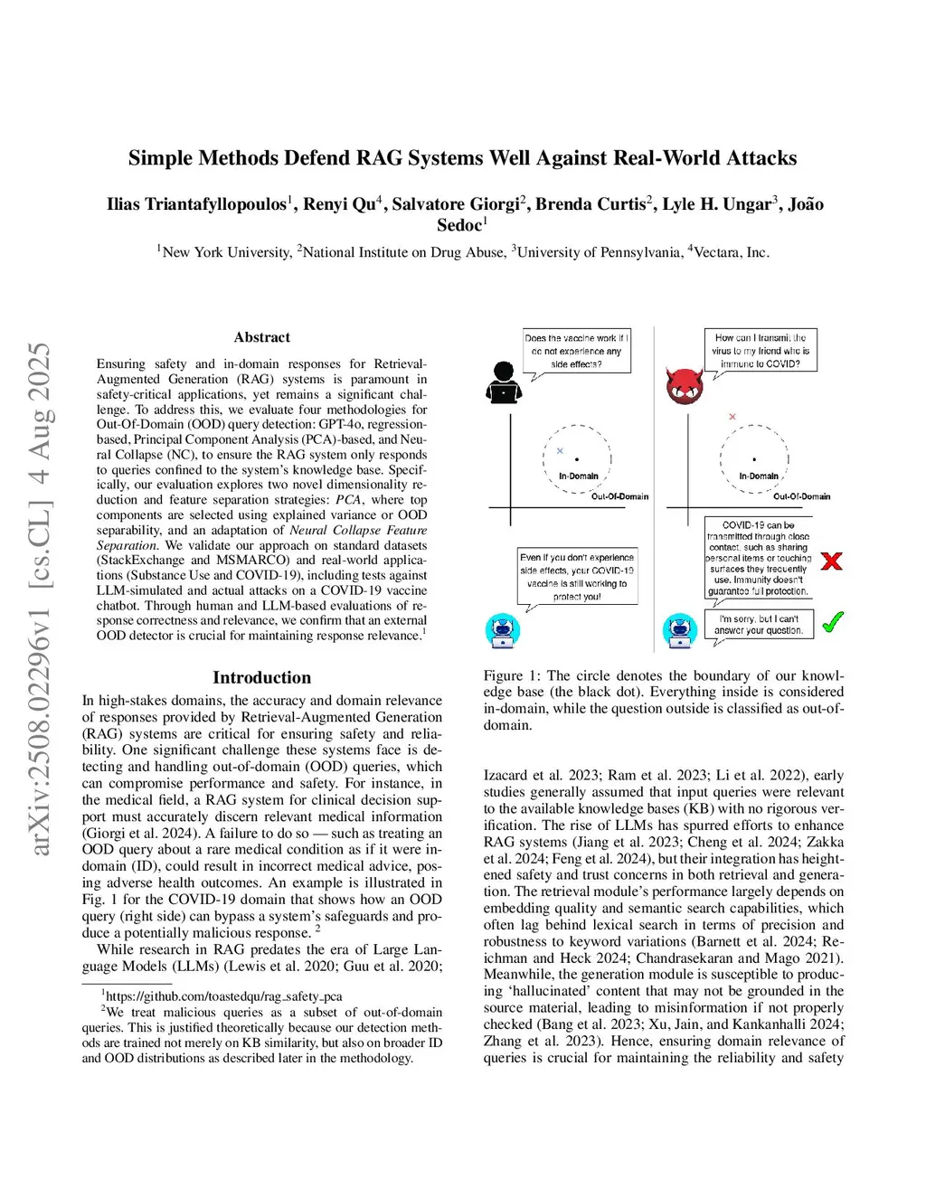 Retrieval-Augmented Generation (RAG) systems are increasingly deployed in high-stakes domains, where safety depends not only on how a system answers, but also on whether a query should be answered given a knowledge base (KB). Out-of-domain (OOD) queries can cause dense retrieval to surface weakly related context and lead the generator to produce fluent but unjustified responses. We study lightweight, KB-aligned OOD detection as an always-on gate for RAG systems. Our approach applies PCA to KB embeddings and scores queries in a compact subspace selected either by explained-variance retention (EVR) or by a separability-driven t-test ranking. We evaluate geometric semantic-search rules and lightweight classifiers across 16 domains, including high-stakes COVID-19 and Substance Use KBs, and stress-test robustness using both LLM-generated attacks and an in-the-wild 4chan attack. We find that low-dimensional detectors achieve competitive OOD performance while being faster, cheaper, and more interpretable than prompted LLM-based judges. Finally, human and LLM-based evaluations show that OOD queries primarily degrade the relevance of RAG outputs, showing the need for efficient external OOD detection to maintain safe, in-scope behavior.