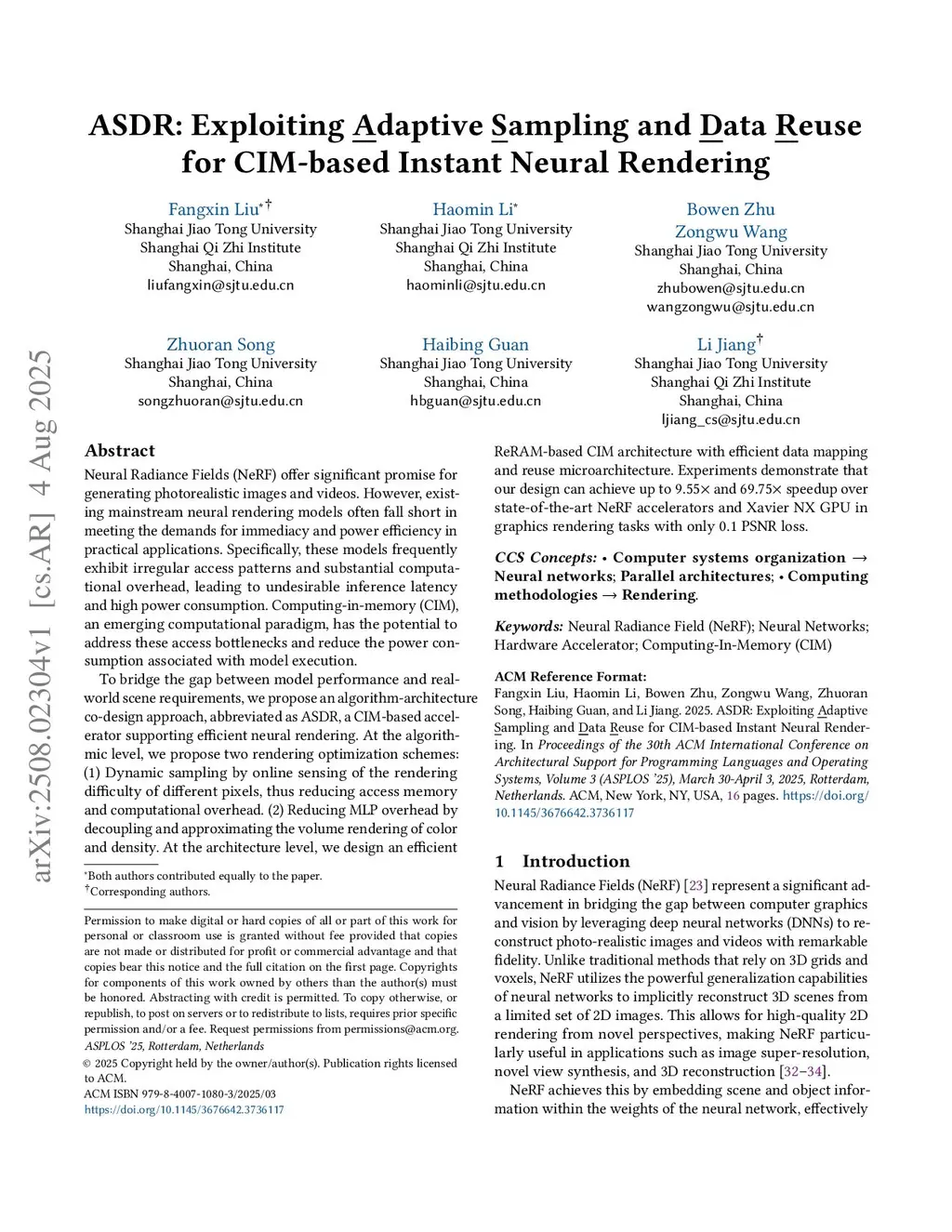 Neural Radiance Fields (NeRF) offer significant promise for generating photorealistic images and videos. However, existing mainstream neural rendering models often fall short in meeting the demands for immediacy and power efficiency in practical applications. Specifically, these models frequently exhibit irregular access patterns and substantial computational overhead, leading to undesirable inference latency and high power consumption. Computing-in-memory (CIM), an emerging computational paradigm, has the potential to address these access bottlenecks and reduce the power consumption associated with model execution.To bridge the gap between model performance and real-world scene requirements, we propose an algorithm-architecture co-design approach, abbreviated as ASDR, a CIM-based accelerator supporting efficient neural rendering. At the algorithmic level, we propose two rendering optimization schemes: (1) Dynamic sampling by online sensing of the rendering difficulty of different pixels, thus reducing access memory and computational overhead. (2) Reducing MLP overhead by decoupling and approximating the volume rendering of color and density. At the architecture level, we design an efficient ReRAM-based CIM architecture with efficient data mapping and reuse microarchitecture. Experiments demonstrate that our design can achieve up to and speedup over state-of-the-art NeRF accelerators and Xavier NX GPU in graphics rendering tasks with only PSNR loss.