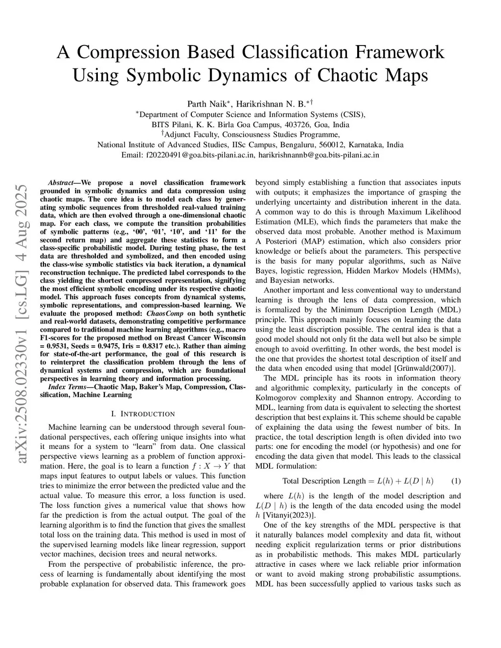We propose a novel classification framework grounded in symbolic dynamics and data compression using chaotic maps. The core idea is to model each class by generating symbolic sequences from thresholded real-valued training data, which are then evolved through a one-dimensional chaotic map. For each class, we compute the transition probabilities of symbolic patterns (e.g., `00', `01', `10', and `11' for the second return map) and aggregate these statistics to form a class-specific probabilistic model. During testing phase, the test data are thresholded and symbolized, and then encoded using the class-wise symbolic statistics via back iteration, a dynamical reconstruction technique. The predicted label corresponds to the class yielding the shortest compressed representation, signifying the most efficient symbolic encoding under its respective chaotic model. This approach fuses concepts from dynamical systems, symbolic representations, and compression-based learning. We evaluate the proposed method: \emph{ChaosComp} on both synthetic and real-world datasets, demonstrating competitive performance compared to traditional machine learning algorithms (e.g., macro F1-scores for the proposed method on Breast Cancer Wisconsin = 0.9531, Seeds = 0.9475, Iris = 0.8469 etc.). Rather than aiming for state-of-the-art performance, the goal of this research is to reinterpret the classification problem through the lens of dynamical systems and compression, which are foundational perspectives in learning theory and information processing.