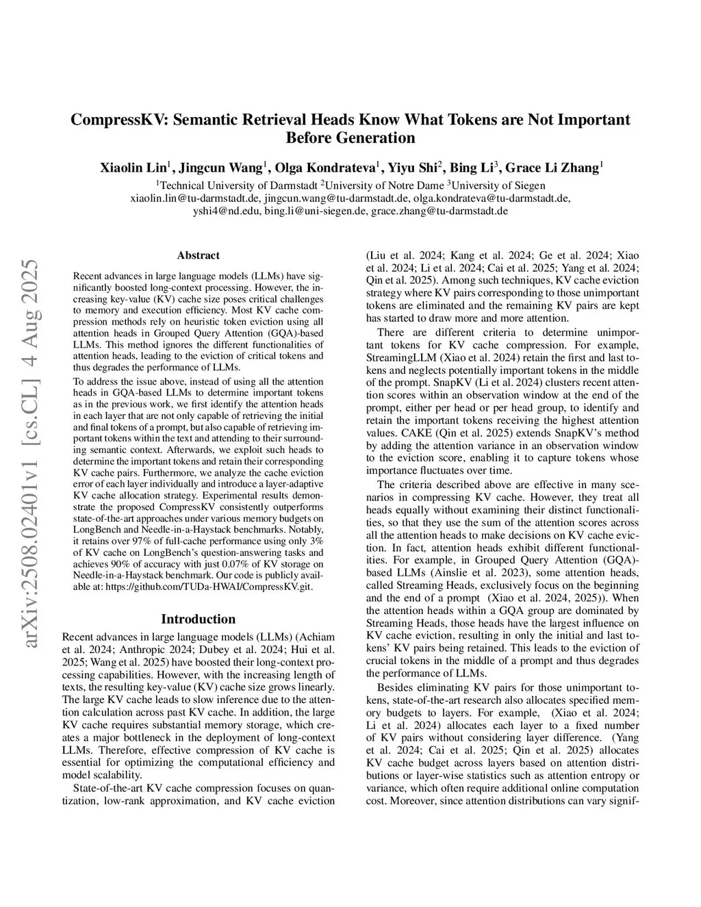 Recent advances in large language models (LLMs) have significantly boosted long-context processing. However, the increasing key-value (KV) cache size poses critical challenges to memory and execution efficiency. Most KV cache compression methods rely on heuristic token eviction using all attention heads in Grouped Query Attention (GQA)-based LLMs. This method ignores the different functionalities of attention heads, leading to the eviction of critical tokens and thus degrades the performance of LLMs.To address the issue above, instead of using all the attention heads in GQA-based LLMs to determine important tokens as in the previous work, we first identify the attention heads in each layer that are not only capable of retrieving the initial and final tokens of a prompt, but also capable of retrieving important tokens within the text and attending to their surrounding semantic context. Afterwards, we exploit such heads to determine the important tokens and retain their corresponding KV cache pairs. Furthermore, we analyze the cache eviction error of each layer individually and introduce a layer-adaptive KV cache allocation strategy. Experimental results demonstrate the proposed CompressKV consistently outperforms state-of-the-art approaches under various memory budgets on LongBench and Needle-in-a-Haystack benchmarks. Our code is publicly available at:this https URL.