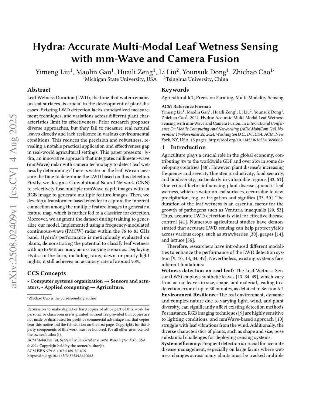 Hydra: Accurate Multi-Modal Leaf Wetness Sensing with mm-Wave and Camera Fusion