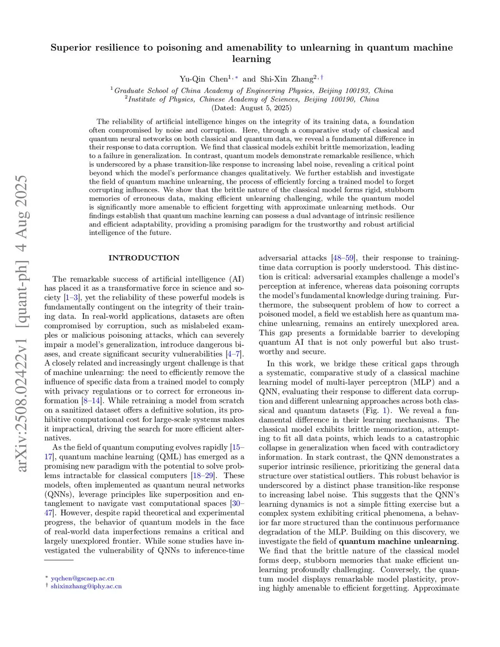 The reliability of artificial intelligence hinges on the integrity of its training data, a foundation often compromised by noise and corruption. Here, through a comparative study of classical and quantum neural networks on both classical and quantum data, we reveal a fundamental difference in their response to data corruption. We find that classical models exhibit brittle memorization, leading to a failure in generalization. In contrast, quantum models demonstrate remarkable resilience, which is underscored by a phase transition-like response to increasing label noise, revealing a critical point beyond which the model's performance changes qualitatively. We further establish and investigate the field of quantum machine unlearning, the process of efficiently forcing a trained model to forget corrupting influences. We show that the brittle nature of the classical model forms rigid, stubborn memories of erroneous data, making efficient unlearning challenging, while the quantum model is significantly more amenable to efficient forgetting with approximate unlearning methods. Our findings establish that quantum machine learning can possess a dual advantage of intrinsic resilience and efficient adaptability, providing a promising paradigm for the trustworthy and robust artificial intelligence of the future.