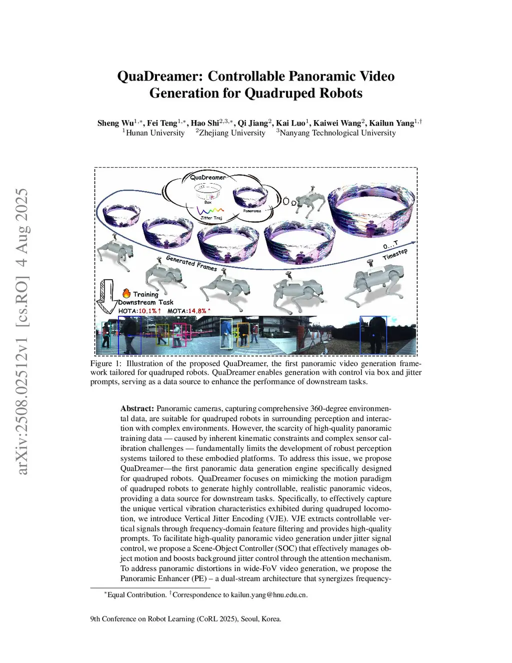 Panoramic cameras, capturing comprehensive 360-degree environmental data, are suitable for quadruped robots in surrounding perception and interaction with complex environments. However, the scarcity of high-quality panoramic training data-caused by inherent kinematic constraints and complex sensor calibration challenges-fundamentally limits the development of robust perception systems tailored to these embodied platforms. To address this issue, we propose QuaDreamer-the first panoramic data generation engine specifically designed for quadruped robots. QuaDreamer focuses on mimicking the motion paradigm of quadruped robots to generate highly controllable, realistic panoramic videos, providing a data source for downstream tasks. Specifically, to effectively capture the unique vertical vibration characteristics exhibited during quadruped locomotion, we introduce Vertical Jitter Encoding (VJE). VJE extracts controllable vertical signals through frequency-domain feature filtering and provides high-quality prompts. To facilitate high-quality panoramic video generation under jitter signal control, we propose a Scene-Object Controller (SOC) that effectively manages object motion and boosts background jitter control through the attention mechanism. To address panoramic distortions in wide-FoV video generation, we propose the Panoramic Enhancer (PE)-a dual-stream architecture that synergizes frequency-texture refinement for local detail enhancement with spatial-structure correction for global geometric consistency. We further demonstrate that the generated video sequences can serve as training data for the quadruped robot's panoramic visual perception model, enhancing the performance of multi-object tracking in 360-degree scenes. The source code and model weights will be publicly available at this https URL.