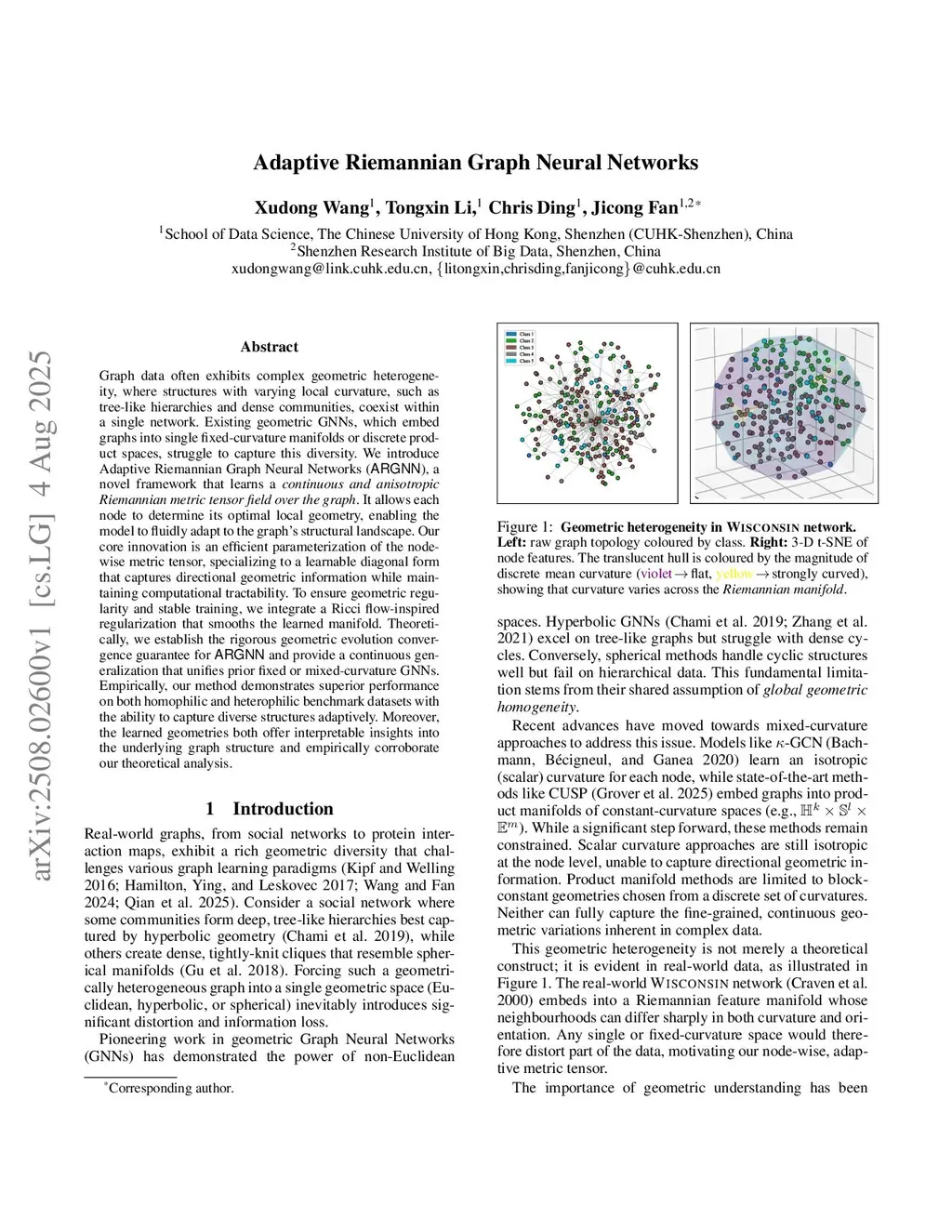 Graph data often exhibits complex geometric heterogeneity, where structures with varying local curvature, such as tree-like hierarchies and dense communities, coexist within a single network. Existing geometric GNNs, which embed graphs into single fixed-curvature manifolds or discrete product spaces, struggle to capture this diversity. We introduce Adaptive Riemannian Graph Neural Networks (ARGNN), a novel framework that learns a continuous and anisotropic Riemannian metric tensor field over the graph. It allows each node to determine its optimal local geometry, enabling the model to fluidly adapt to the graph's structural landscape. Our core innovation is an efficient parameterization of the node-wise metric tensor, specializing to a learnable diagonal form that captures directional geometric information while maintaining computational tractability. To ensure geometric regularity and stable training, we integrate a Ricci flow-inspired regularization that smooths the learned manifold. Theoretically, we establish the rigorous geometric evolution convergence guarantee for ARGNN and provide a continuous generalization that unifies prior fixed or mixed-curvature GNNs. Empirically, our method demonstrates superior performance on both homophilic and heterophilic benchmark datasets with the ability to capture diverse structures adaptively. Moreover, the learned geometries both offer interpretable insights into the underlying graph structure and empirically corroborate our theoretical analysis.