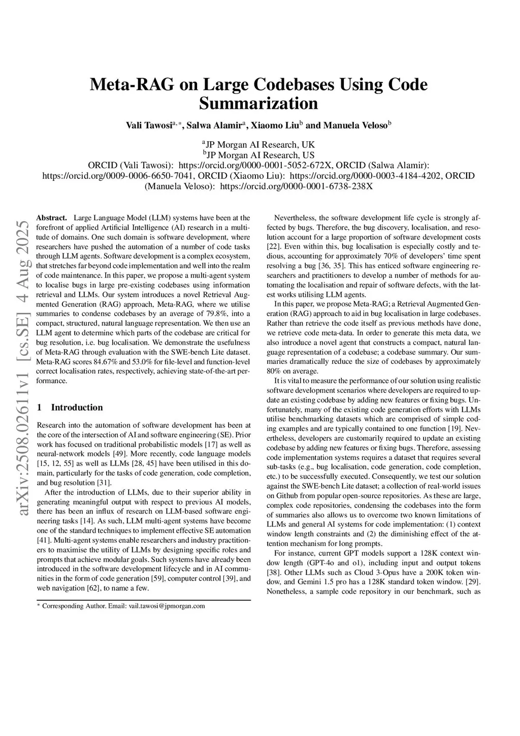Large Language Model (LLM) systems have been at the forefront of applied Artificial Intelligence (AI) research in a multitude of domains. One such domain is software development, where researchers have pushed the automation of a number of code tasks through LLM agents. Software development is a complex ecosystem, that stretches far beyond code implementation and well into the realm of code maintenance. In this paper, we propose a multi-agent system to localize bugs in large pre-existing codebases using information retrieval and LLMs. Our system introduces a novel Retrieval Augmented Generation (RAG) approach, Meta-RAG, where we utilize summaries to condense codebases by an average of 79.8\%, into a compact, structured, natural language representation. We then use an LLM agent to determine which parts of the codebase are critical for bug resolution, i.e. bug localization. We demonstrate the usefulness of Meta-RAG through evaluation with the SWE-bench Lite dataset. Meta-RAG scores 84.67 % and 53.0 % for file-level and function-level correct localization rates, respectively, achieving state-of-the-art performance.