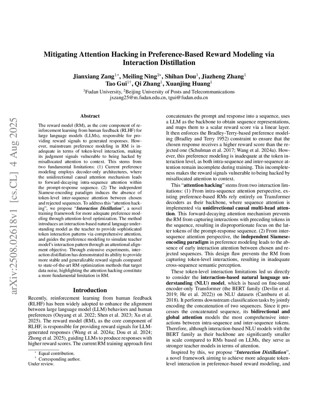 The reward model (RM), as the core component of reinforcement learning from human feedback (RLHF) for large language models (LLMs), responsible for providing reward signals to generated responses. However, the mainstream discriminative reward modeling is inadequate in terms of token-level interaction, making its judgment signals vulnerable to being hacked by misallocated attention to context. This stems from two fundamental limitations: (1) Current preference modeling employs decoder-only architectures, where the unidirectional causal attention mechanism leads to forward-decaying intra-sequence attention within the prompt-response sequence. (2) The independent Siamese-encoding paradigm induces the absence of token-level inter-sequence attention between chosen and rejected sequences. To address this "attention hacking", we propose "Interaction Distillation", a novel training framework for more adequate discriminative reward modeling via attention-level optimization. The method introduces an interaction-based natural language understanding model as the teacher to provide sophisticated token interaction patterns via comprehensive attention, and guides the reward modeling to simulate teacher model's interaction pattern through an attentional alignment objective. Through extensive experiments, interaction distillation has demonstrated its ability to provide more stable and generalizable reward signals compared to state-of-the-art RM optimization methods that target data noise, highlighting the attention hacking constitute a more fundamental limitation in discriminative RM.