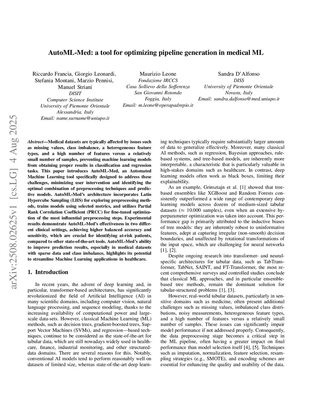 Medical datasets are typically affected by issues such as missing values, class imbalance, a heterogeneous feature types, and a high number of features versus a relatively small number of samples, preventing machine learning models from obtaining proper results in classification and regression tasks. This paper introduces AutoML-Med, an Automated Machine Learning tool specifically designed to address these challenges, minimizing user intervention and identifying the optimal combination of preprocessing techniques and predictive models. AutoML-Med's architecture incorporates Latin Hypercube Sampling (LHS) for exploring preprocessing methods, trains models using selected metrics, and utilizes Partial Rank Correlation Coefficient (PRCC) for fine-tuned optimization of the most influential preprocessing steps. Experimental results demonstrate AutoML-Med's effectiveness in two different clinical settings, achieving higher balanced accuracy and sensitivity, which are crucial for identifying at-risk patients, compared to other state-of-the-art tools. AutoML-Med's ability to improve prediction results, especially in medical datasets with sparse data and class imbalance, highlights its potential to streamline Machine Learning applications in healthcare.