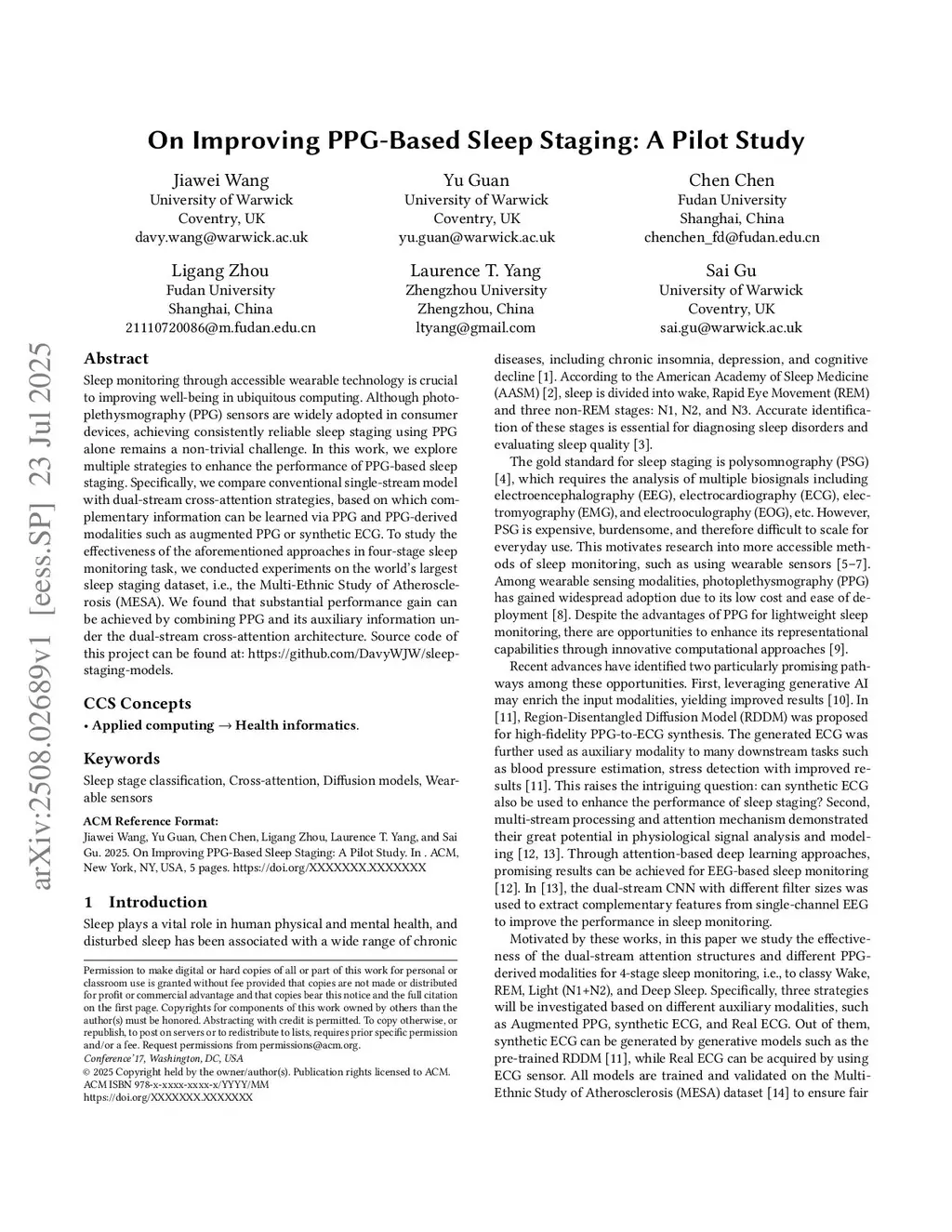 Sleep monitoring through accessible wearable technology is crucial to improving well-being in ubiquitous computing. Although photoplethysmography(PPG) sensors are widely adopted in consumer devices, achieving consistently reliable sleep staging using PPG alone remains a non-trivial challenge. In this work, we explore multiple strategies to enhance the performance of PPG-based sleep staging. Specifically, we compare conventional single-stream model with dual-stream cross-attention strategies, based on which complementary information can be learned via PPG and PPG-derived modalities such as augmented PPG or synthetic ECG. To study the effectiveness of the aforementioned approaches in four-stage sleep monitoring task, we conducted experiments on the world's largest sleep staging dataset, i.e., the Multi-Ethnic Study of Atherosclerosis(MESA). We found that substantial performance gain can be achieved by combining PPG and its auxiliary information under the dual-stream cross-attention architecture. Source code of this project can be found atthis https URL