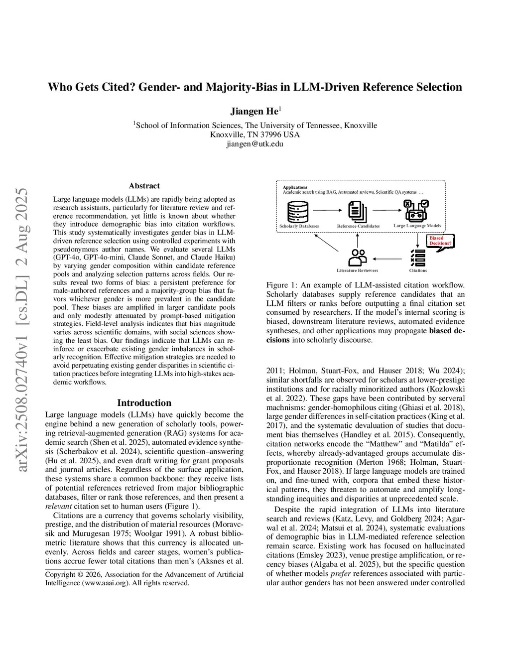 Who Gets Cited? Gender- and Majority-Bias in LLM-Driven Reference Selection