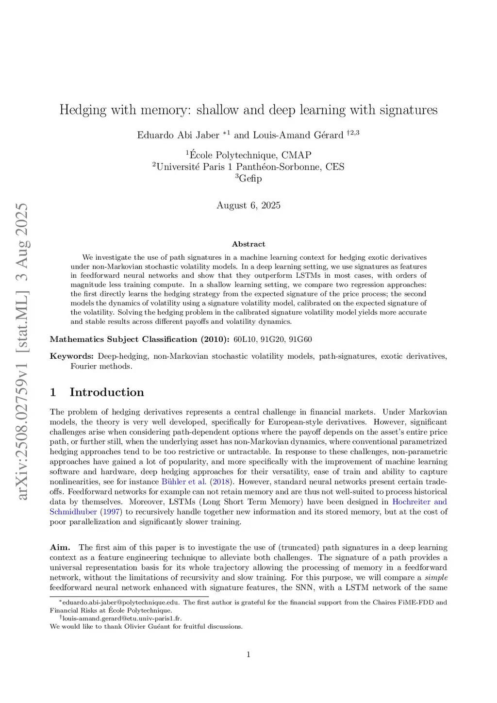 We investigate the use of path signatures in a machine learning context for hedging exotic derivatives under non-Markovian stochastic volatility models. In a deep learning setting, we use signatures as features in feedforward neural networks and show that they outperform LSTMs in most cases, with orders of magnitude less training compute. In a shallow learning setting, we compare two regression approaches: the first directly learns the hedging strategy from the expected signature of the price process; the second models the dynamics of volatility using a signature volatility model, calibrated on the expected signature of the volatility. Solving the hedging problem in the calibrated signature volatility model yields more accurate and stable results across different payoffs and volatility dynamics.